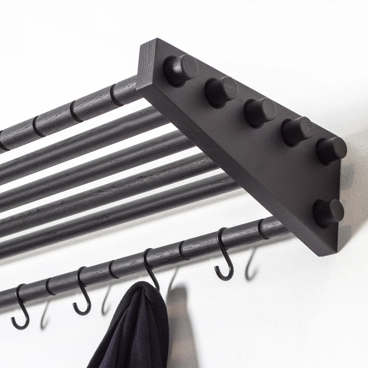 Die Roon & Rahn Moodrack Wandgarderobe von We Do Wood ist ein Multifunktionstalent im Flur. An den praktischen S-Haken sammelt die Garderobe die liebsten Schals und Jacken, während die Ablagefläche darüber für Hüte, Handschuhe, Helme oder Taschen verwendet werden kann.