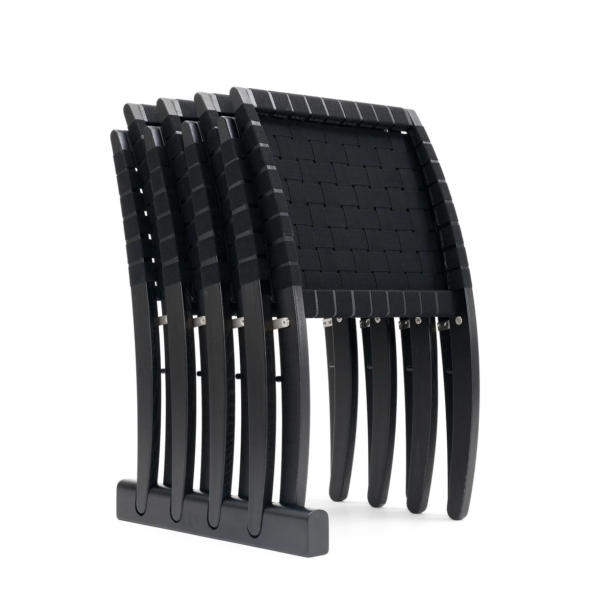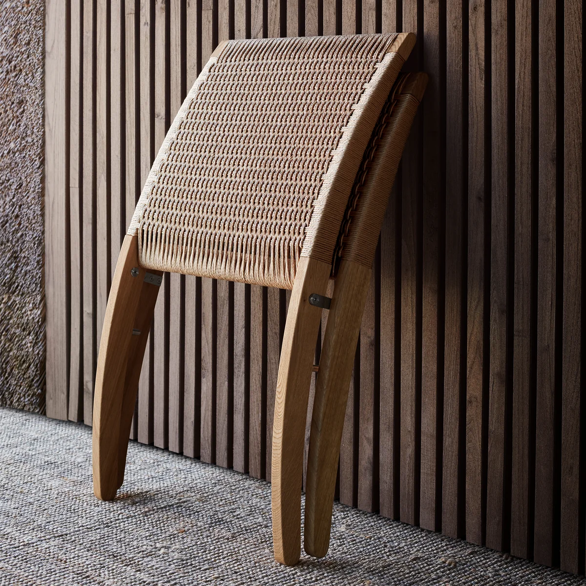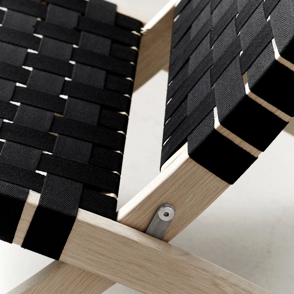 Das massive Gestell des Klappstuhls ist aus Eichenholz gefertigt. Ergänzt wird die stabile Konstruktion von einem Baumwoll-Gurtgeflecht oder Natur-Geflecht, das Komfort und eine besondere Optik bietet.