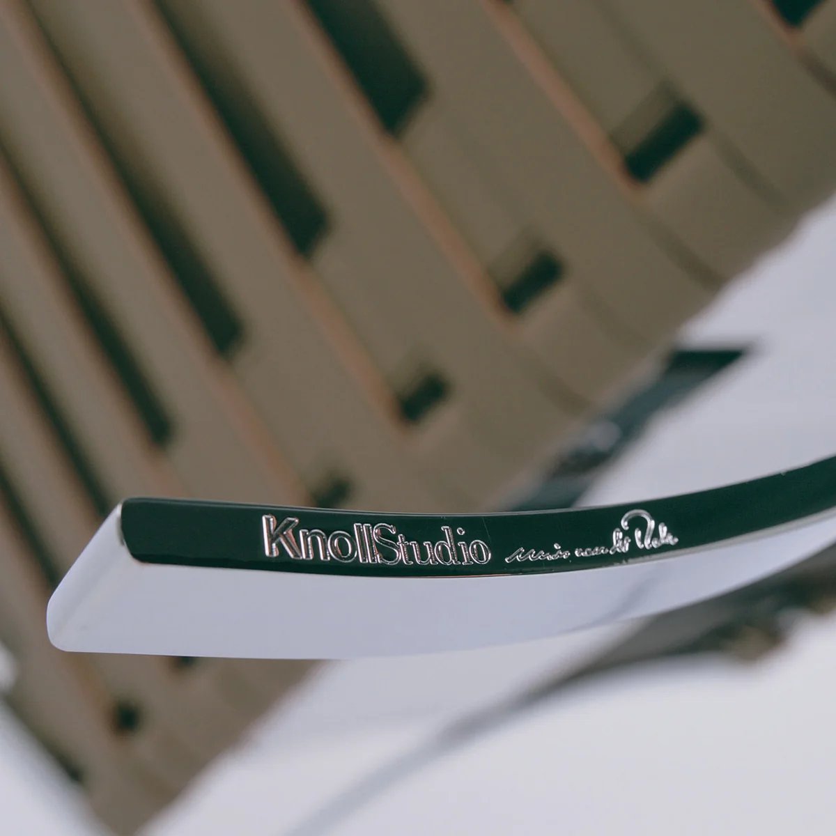 - Aufbau: Das verchromte Gestell wird von Hand hochglanzpoliert. Jedes Kissen besteht aus 40 einzelnen Lederstűcken, die aus einer einzigen Haut handgeschnitten werden und von Hand vernäht und mit Keder und Knöpfe versehen werden. Die sichtbare Seite der Gurte wird passend zur Polsterung eingefärbt.