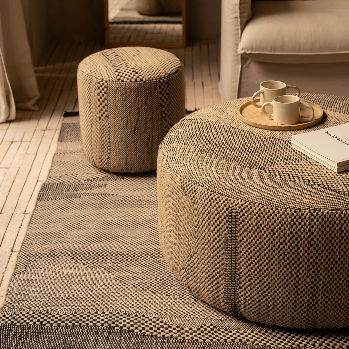 Die Wabisabi Poufs bringen die Philosophie des japanischen Wabi-Sabi in den Wohnraum: Sie feiern das Unvollkommene, Natürliche und Vergängliche. Mit ihrer weichen Haptik, organischen Struktur und harmonischen Farbgebung ergänzen die Poufs stilvoll jede Einrichtung und schaffen eine Atmosphäre der Ruhe. Gefertigt aus 100 % neuseeländischer Wolle, bieten sie nicht nur Komfort, sondern auch handwerkliche Qualität und stilvolle Vielseitigkeit. Die Poufs lassen sich mühelos mit Teppichen der gleichnamigen Kollektion kombinieren.