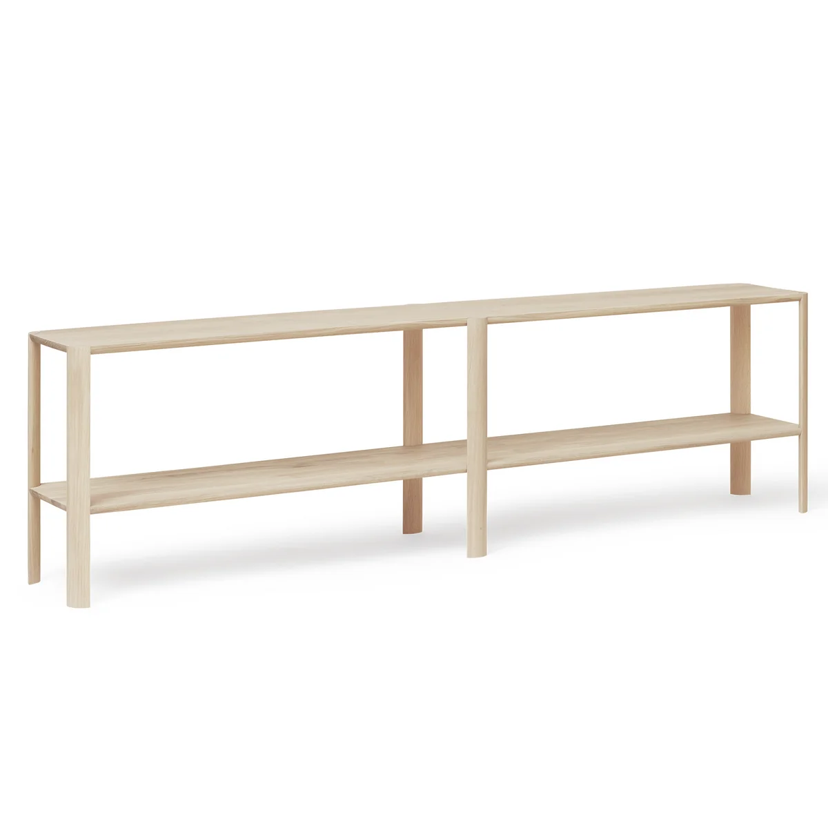 Das Leaf Regal von Form & Refine überzeugt durch seine Verbindung von Ästhetik, Stabilität und Stauraum. Es ist charakterisiert durch seine einfache Form, die die Aufmerksamkeit auf die abgerundeten, blatt-ähnlichen Regalbeine lenkt. Die Konstruktion selbst ist geradlinig ohne sichtbare Schrauben oder zusätzlich stabilisierende Elemente. Sie fügt sich dadurch gut in beliebig eingerichtete Wohnzimmer, Schlafzimmer oder Büros ein und bietet darüber hinaus viel Stauraum für Bücher, Boxen und mehr.