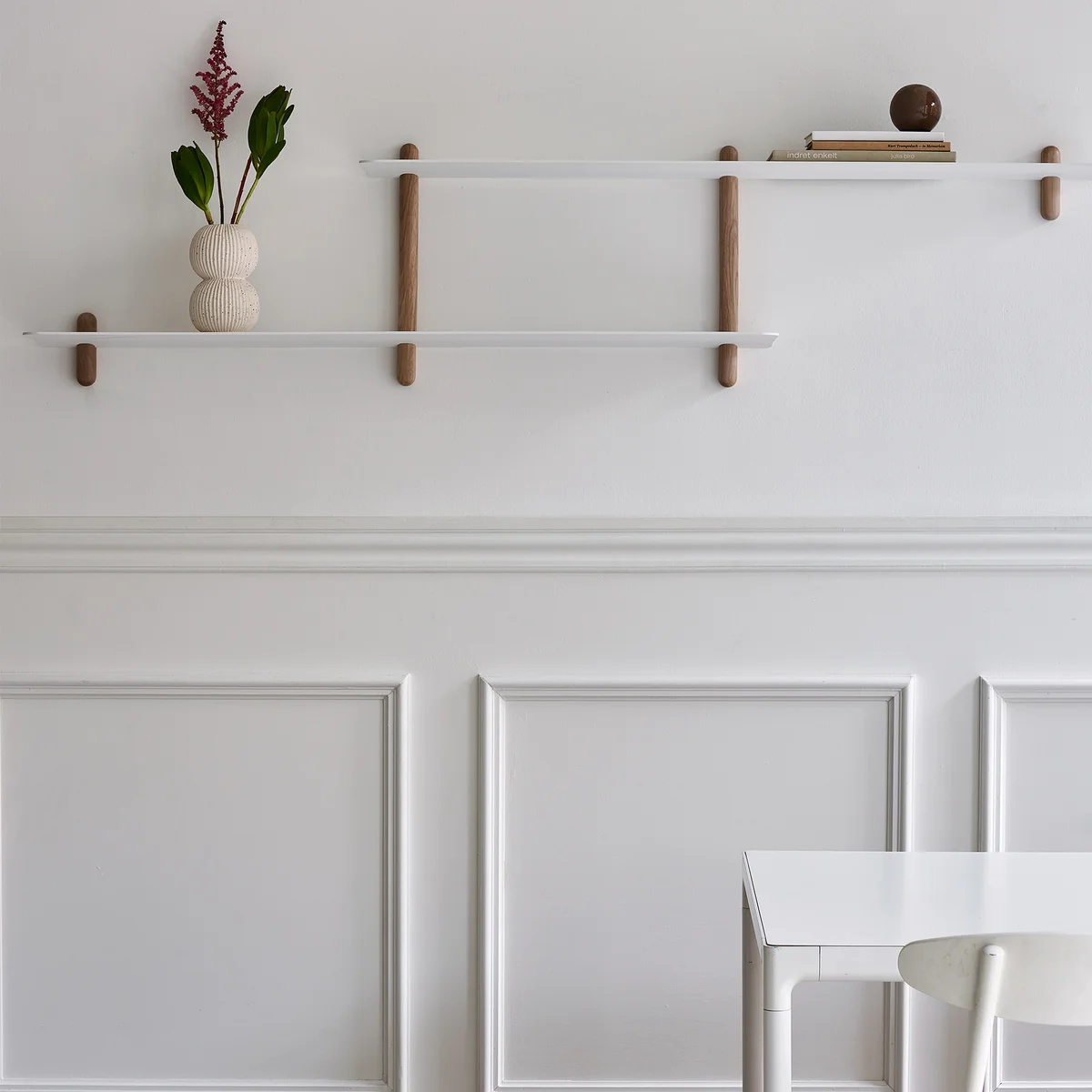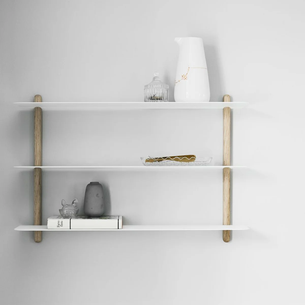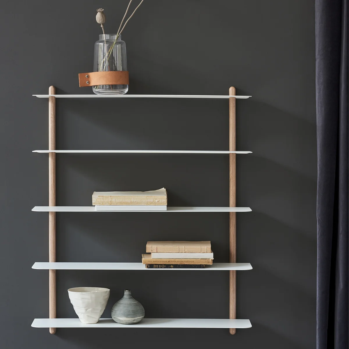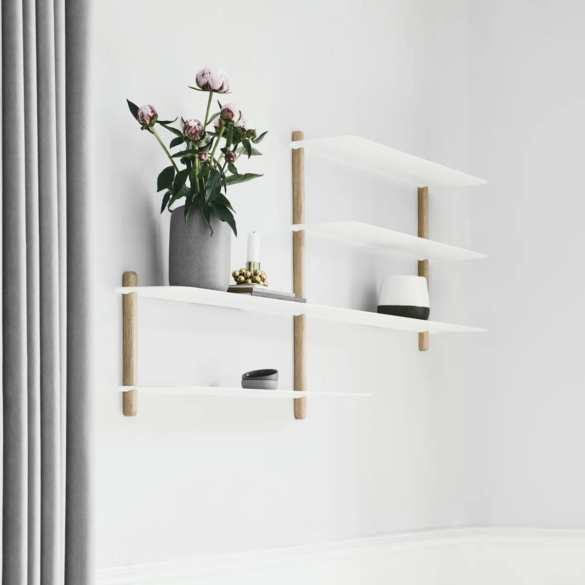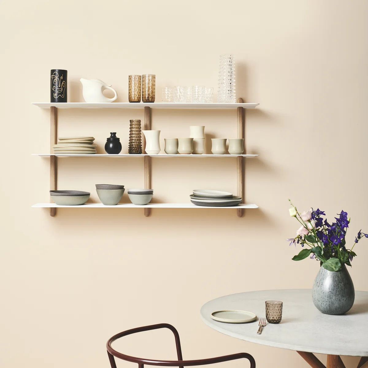 Vasen und Bücher lassen sich in dem Nivo Wandregal hervorragend in Szene setzen. Erhältlich ist das Regal in verschiedenen Farben und Konfigurationen. Die klassische Ausführung kann eine max. Belastung von 3 kg. pro Fachboden tragen, die Variante in Large kann ein Gewicht von bis zu 10 kg tragen.