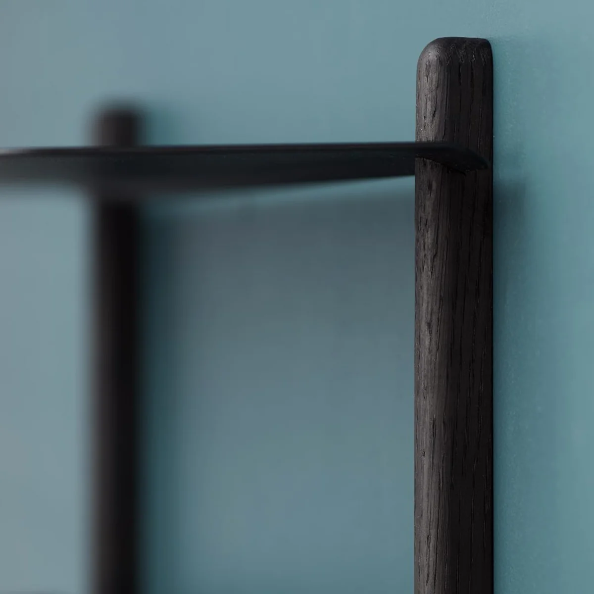 Besonders ist an dem Regal, dass es keine sichtbaren Schrauben gibt. Die Regalböden sind reibungslos in die Holzstangen eingesteckt, die passgenau geschlitzt sind. So entsteht ein schwebender Eindruck, der dem Regal eine gewisse Leichtigkeit verleiht.