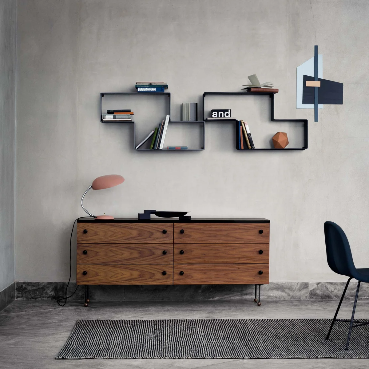 Das Dédal Bücherregal in seiner abstrakten Funktionalität ist ein typisches Beispiel für den Stil des Designers Mathieu Matégot. Das Bücherregal lässt sich individuell zusammenstellen - je nachdem, wie die Elemente kombiniert werden können diese vertikal oder horizontal an der Wand montiert werden.