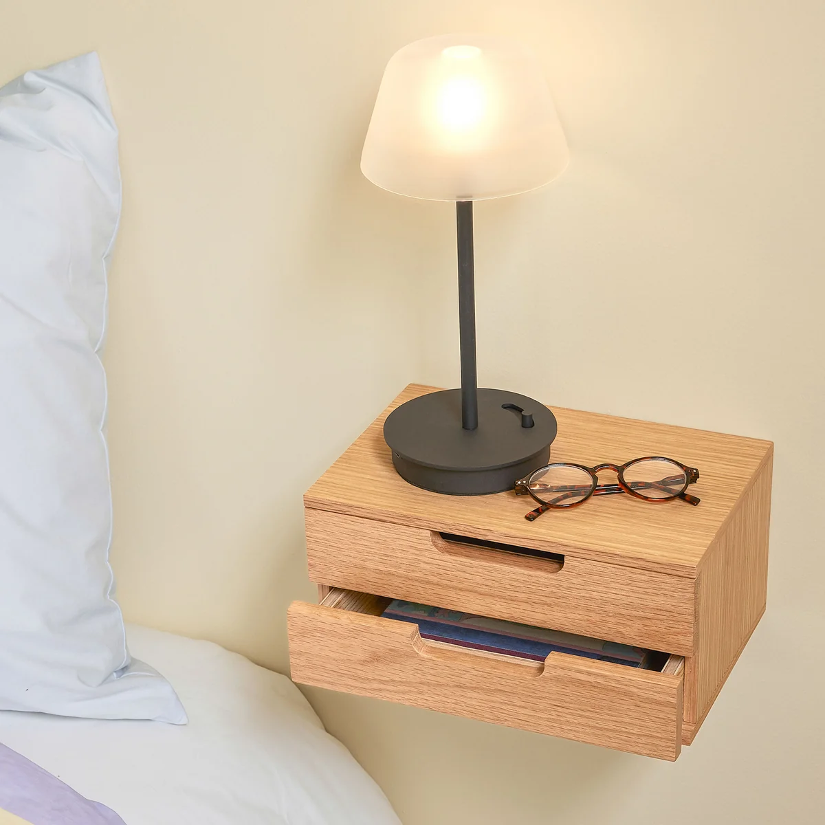 Das vielseitige und elegante AtHand Wandregal von Hübsch Interior ist die optimale Wahl für jene, die ihrem Raum Funktionalität und Anmut verleihen möchten. Hergestellt aus FSC-zertifiziertem Naturholz mit einem wunderschönen Eichenfurnier, verkörpert dieses zeitlose Möbelstück nicht nur Umweltfreundlichkeit, sondern auch visuelle Eleganz. Dank seiner kompakten Größe eignet es sich besonders gut für kleinere Räume und kann mühelos an der Wand neben Ihrem Bett oder im Eingangsbereich angebracht werden. Die zwei Schubladen bieten ausreichend Stauraum für alle wichtigen Gegenstände auf dem Nachttisch, während das leichte, dennoch robuste Design eine langfristige Nutzung gewährleistet.