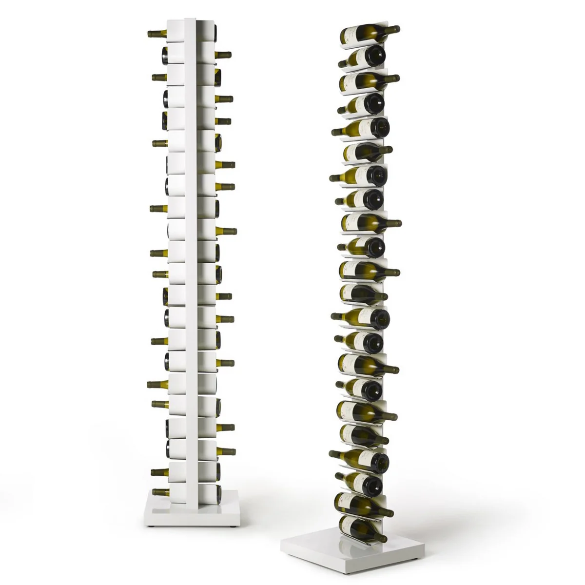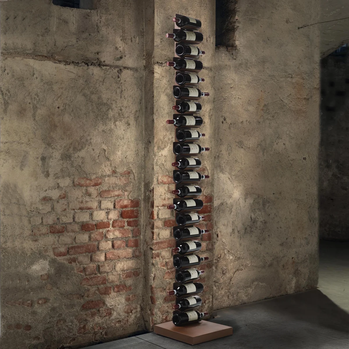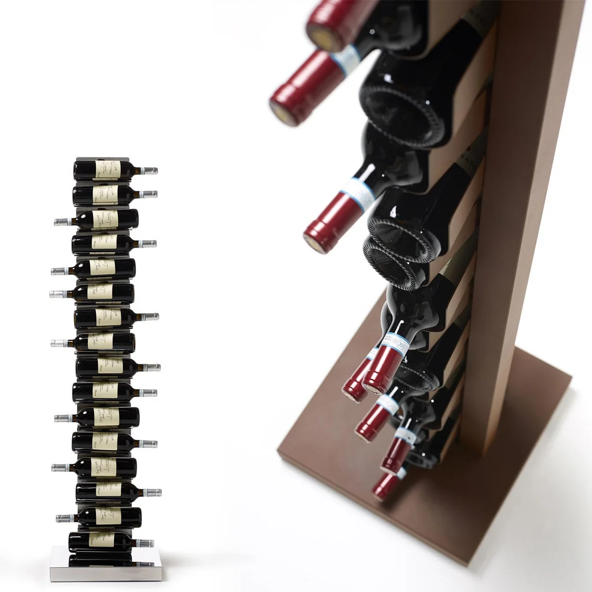 Basis des Regals ist eine Metallsäule, die mit einem System von Leisten verbunden ist. Die Stützten sind dabei so unauffällig wie möglich gestaltet, um dem Betrachter die Vorstellung aufgehängter Flaschen zu vermitteln. Schlank, edel und extravagant ist das Design des Weinflaschenregals, das sich im heimischen Wohnbereich, ebenso gut einfügt wie in Bars oder Hotel Lobbys. Freistehend kann das Regal an einem beliebigen Platz im Raum arrangiert werden.