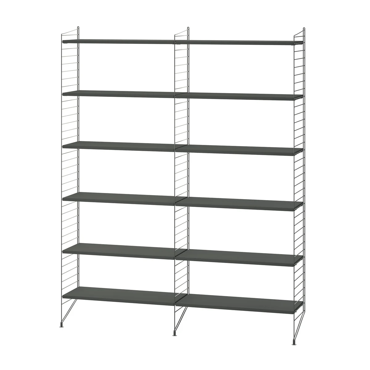 Die Regalkombination von String bietet ein flexibles und modernes Aufbewahrungssystem, das sich ideal für Wohn- und Arbeitsräume eignet. Vorkonfiguriert aus drei stabilen Bodenleitern und 12 robusten Regalböden sorgt sie für viel Stauraum und optimale Ordnung. Das klare, zeitgemäße Design und die hochwertige Verarbeitung garantieren Langlebigkeit und eine vielseitige Anpassungsmöglichkeit an individuelle Raumkonzepte. Die modulare Bauweise ermöglicht es, das Regalsystem flexibel zu erweitern und perfekt in unterschiedliche Umgebungen zu integrieren, wodurch es sowohl als stilvolles Einrichtungselement als auch als funktionale Aufbewahrungslösung überzeugt.