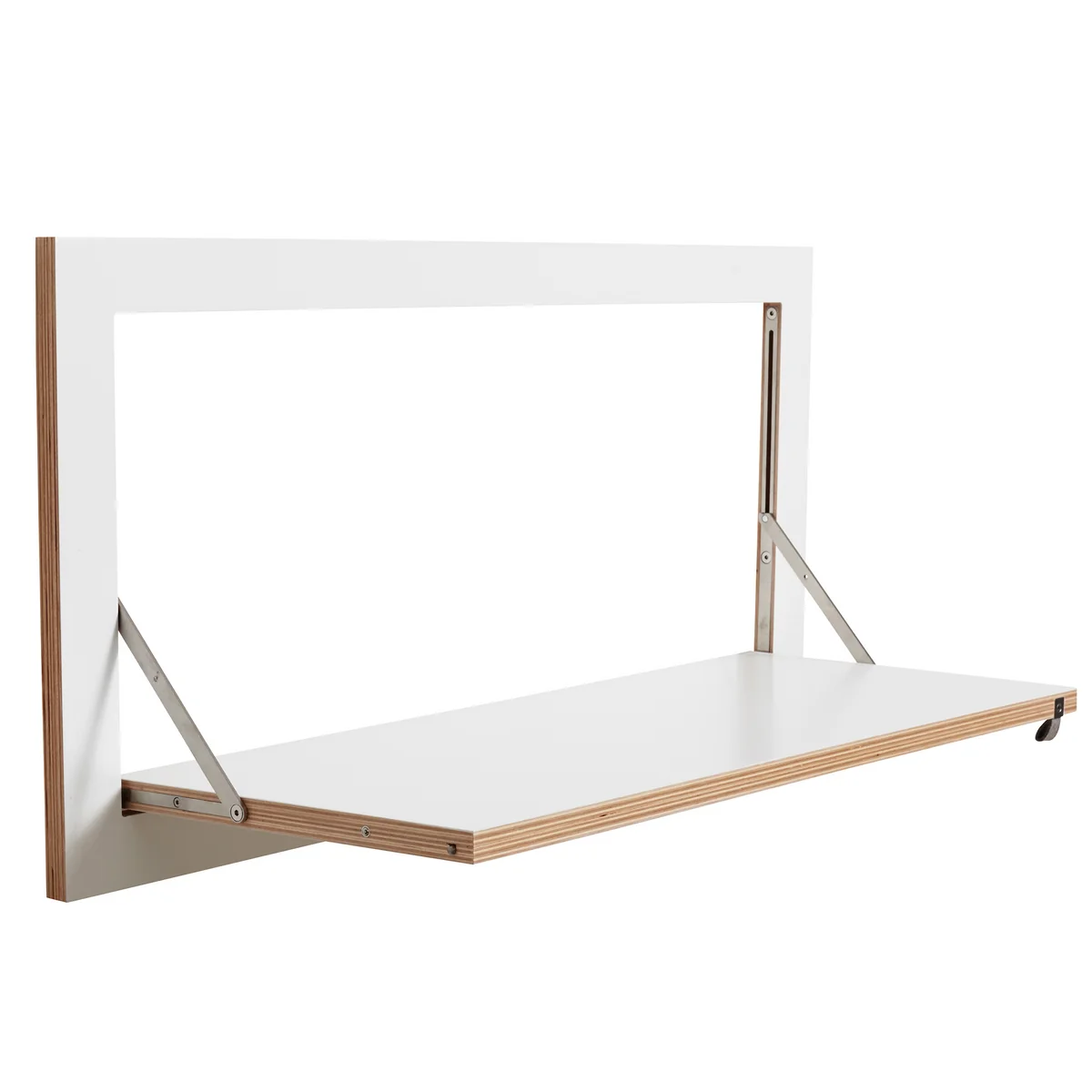 Die Regale werden aus Multiplex Birke mit Edelstahlscharnieren hergestellt. Sie werden in Handarbeit lackiert und sind in verschiedenen Farben erhältlich. Eine kleine Schlaufe aus Filz erleichtert das Herunterklappen des Regalbodens.
