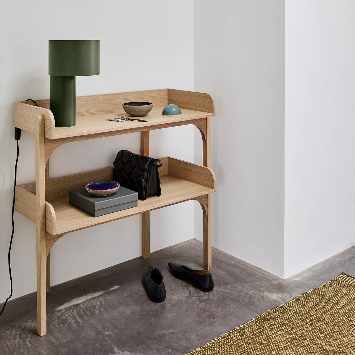 Das Utility Regal der Designerin Rachael Heritage für Woud verbindet die Funktion eines Schranks mit der Leichtigkeit eines offenen Regals. Das vielseitige Design des Regals zeichnet sich durch seine sanften Schwünge und Bögen aus. Utility wird aus natürlichem Eichenmaterial gefertigt, wodurch die Holzkonstruktion eine einzigartige Maserung erhält. Die zwei kompakten Regal mit jeweils drei Seiten laden dazu ein sowohl ästhetische Deko-Elemente als auch praktische Gegenstände zu platzieren, die leicht zugänglich sein sollen. Seien es Handtücher im Bad, Geschirr in der Küche oder Schals und Handschuhe im Flur.