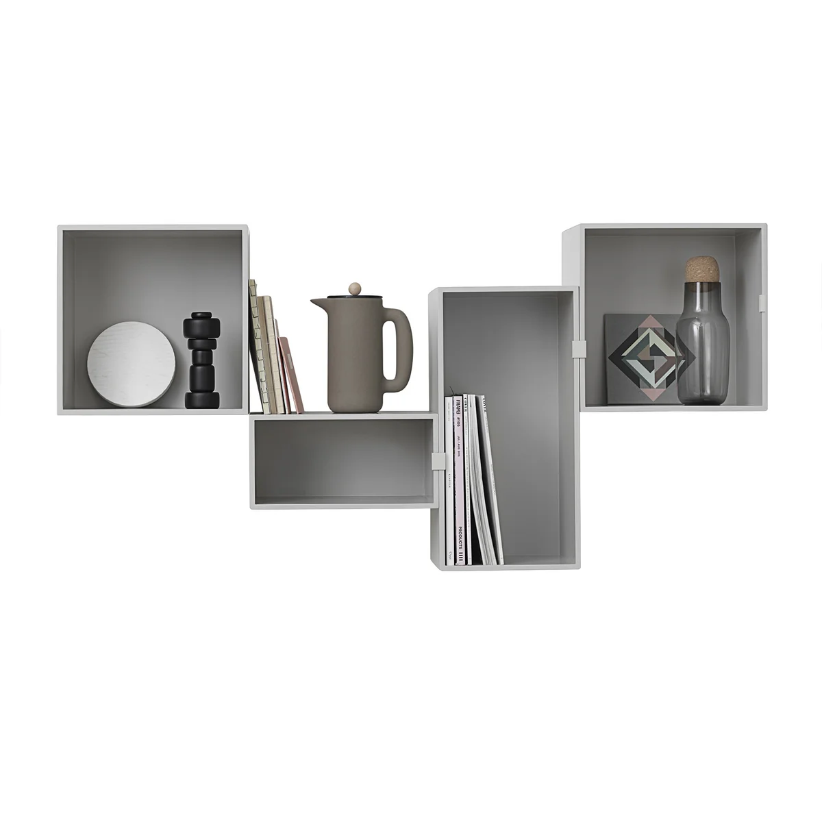 Das Mini Stacked Regalsystem in Hellgrau wird aus lackierten MDF-Platten hergestellt. Jedes Modul lässt sich nach Belieben und Bedarf mit allen anderen Modulen in verschiedenen Farben, Formen und Größen der Stacked Serie kombinieren. So entstehen aus den Stacked Modulen Regale für die Wand und auf den Boden gestellt, Sideboards und auch kleine Beistelltische neben Sofa und Bett.