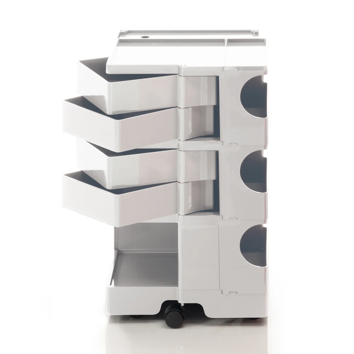 Joe Collombo's Rollcontainer besteht aus leicht zu reinigendem, spritzgegossenen ABS-Kunststoff, er findet im Hobbykeller oder in der Profi-Werkstatt, im Frisiersalon, in Ladengeschäften oder im Badezimmer gleichermaßen Verwendung.
