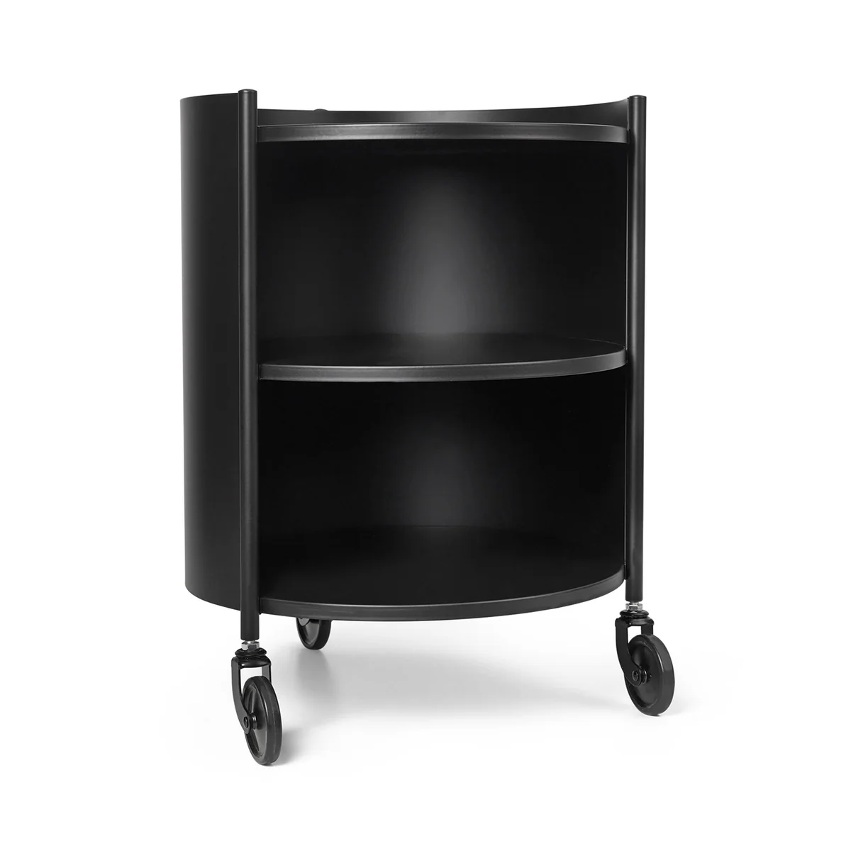 Eve Storage ist ein vielseitiges Möbelstück aus robustem, pulverbeschichtetem Stahl mit drei Einlegeböden, von denen zwei zum Teil hinter dem schlanken Rahmen verborgen sind, das sich durch seine ansprechende Zylinderform und drei große Räder auszeichnet. Stellen Sie eine Tischleuchte auf die oberste Ablage und nutzen Sie Eve Storage als praktischen Nachttisch, verwenden Sie es im Wohnzimmer als stilvollen Beistelltisch oder im Büro, um Ihre wichtigsten Dinge zu verstauen. Dank der funktionalen Räder lässt sich Eve Storage bequem von einem Raum zum anderen bewegen und erfüllt so alle Ihre Aufbewahrungswünsche.