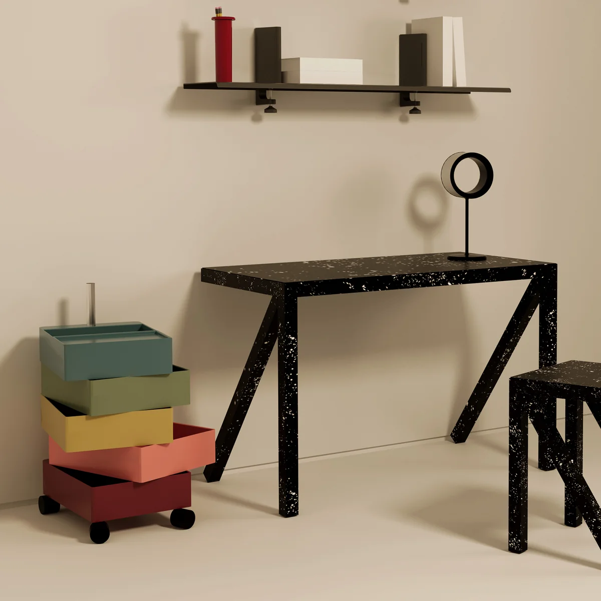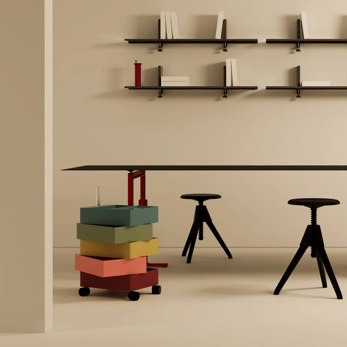 Die glänzenden Materialien wurden von Konstantin Grcic in ein schlichtes Design eingebettet, das sowohl alleine, als auch gemeinsam mit dem passenden 360° Stuhl überzeugt. Je nach Bedarf bietet Magis den 360° Container in zwei Höhen und verschiedenen Farben an. Zum Abdecken der obersten Ablagefläche ist außerdem ein zusätzliches Tablett erhältlich.