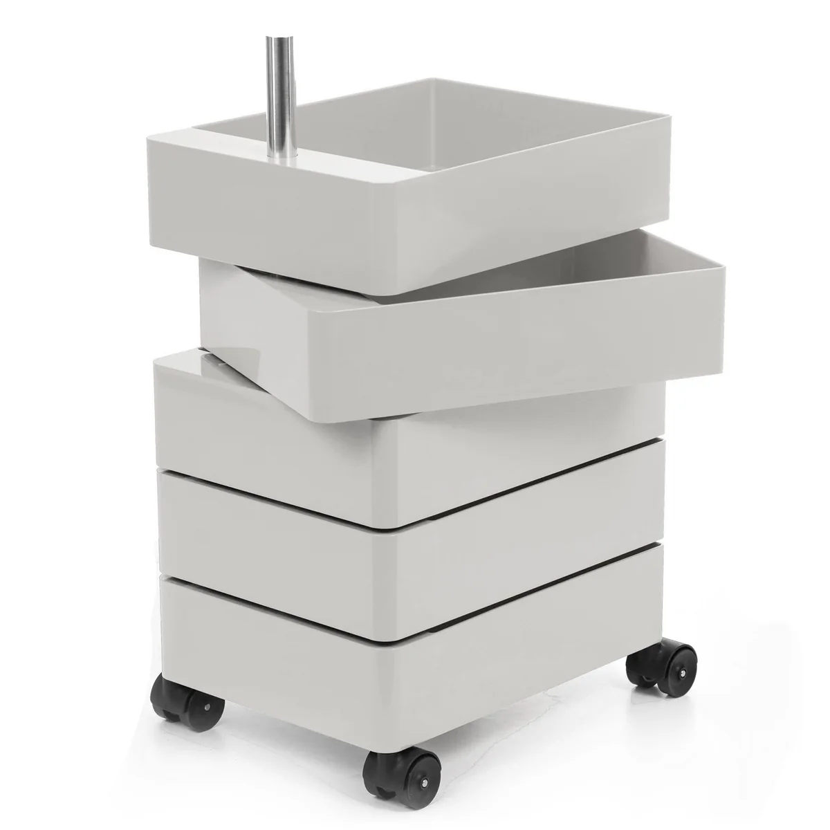 Der 360° Container wurde von Konstantin Grcic zusammen mit dem gleichnamigen Stuhl für den italienischen Hersteller Magis entworfen. Die Idee hinter dem Schubkastencontainer ist die Förderung des dynamischen Arbeitens. Die einzelnen Schubkästen sind um 360° drehbar und können von jeder Seite genutzt werden.