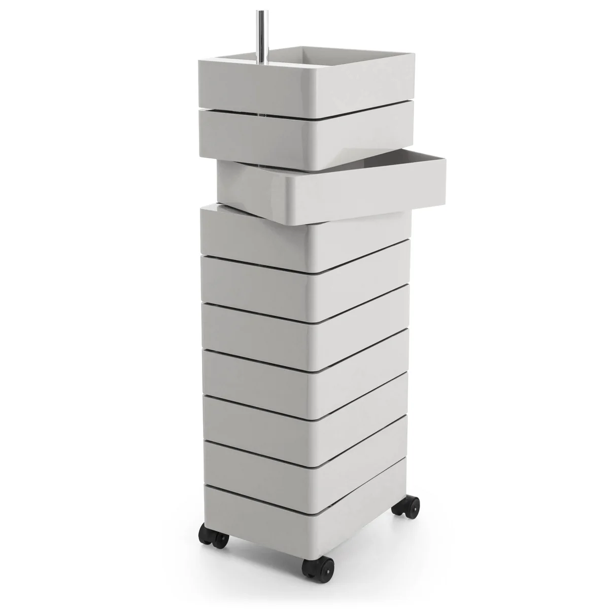Der 360° Container wurde von Konstantin Grcic zusammen mit dem gleichnamigen Stuhl für den italienischen Hersteller Magis entworfen. Die Idee hinter dem Schubkastencontainer ist die Förderung des dynamischen Arbeitens. Die einzelnen Schubkästen sind um 360° drehbar und können von jeder Seite genutzt werden.