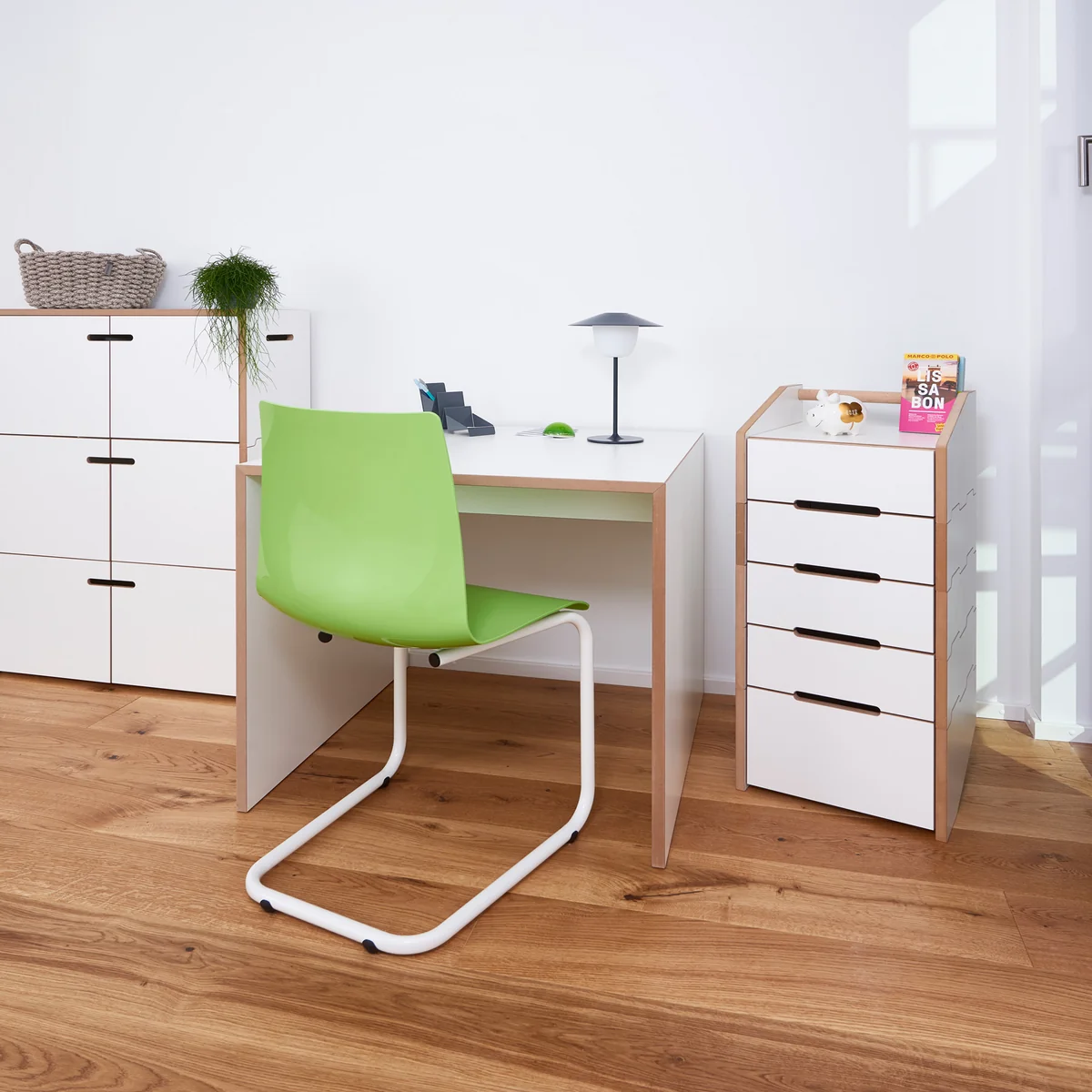 Die Rollen und der Griff ermöglichen ein einfaches Verschieben und machen den Container flexibel einsetzbar. Unter dem Schreibtisch lassen sich in den Modulen mit Schublade aus beschichtetem MDF in Weiß Büroutensilien, Akten, Briefe und vieles mehr verstauen. Neben dem Bett wird cargo zum dekorativen Nachttisch.