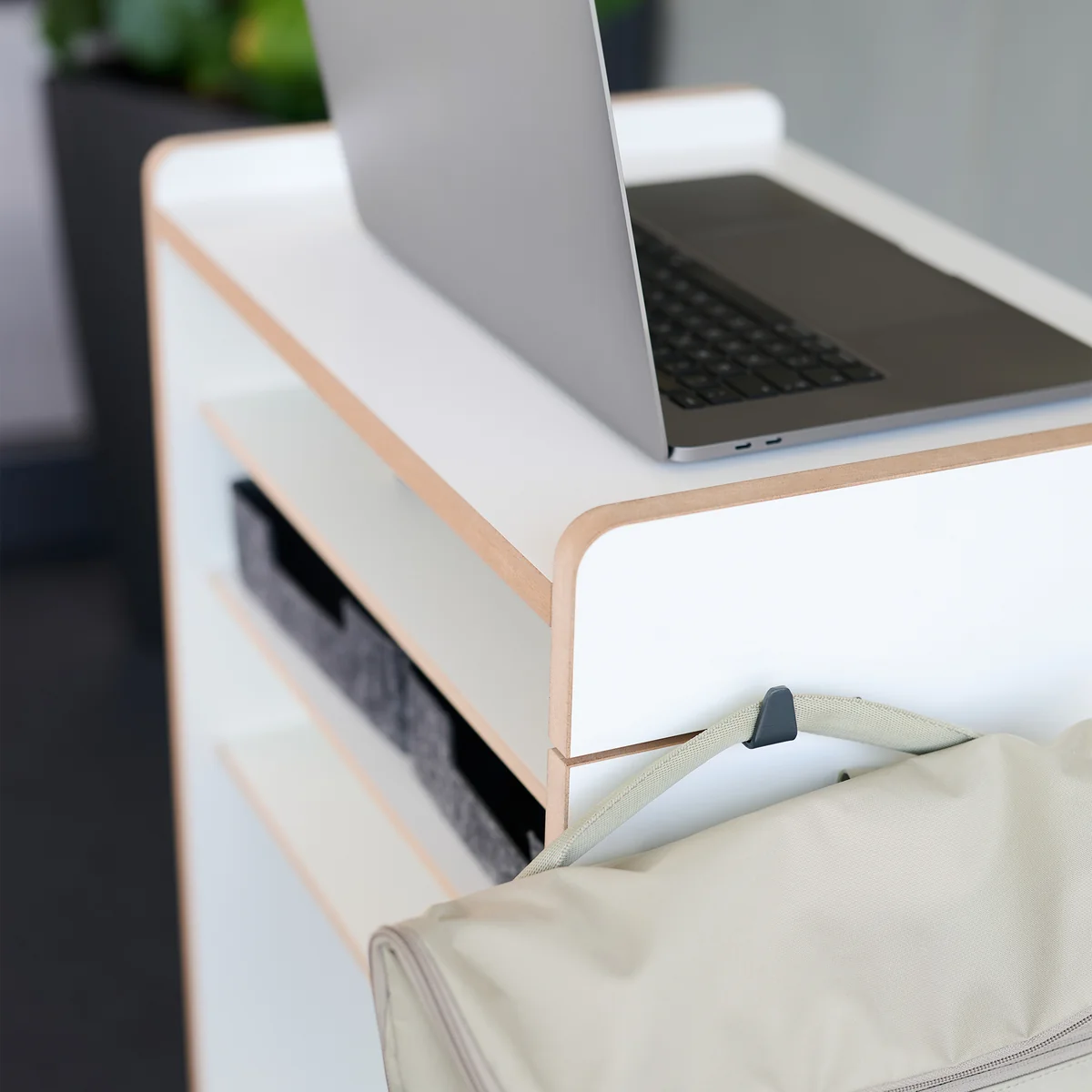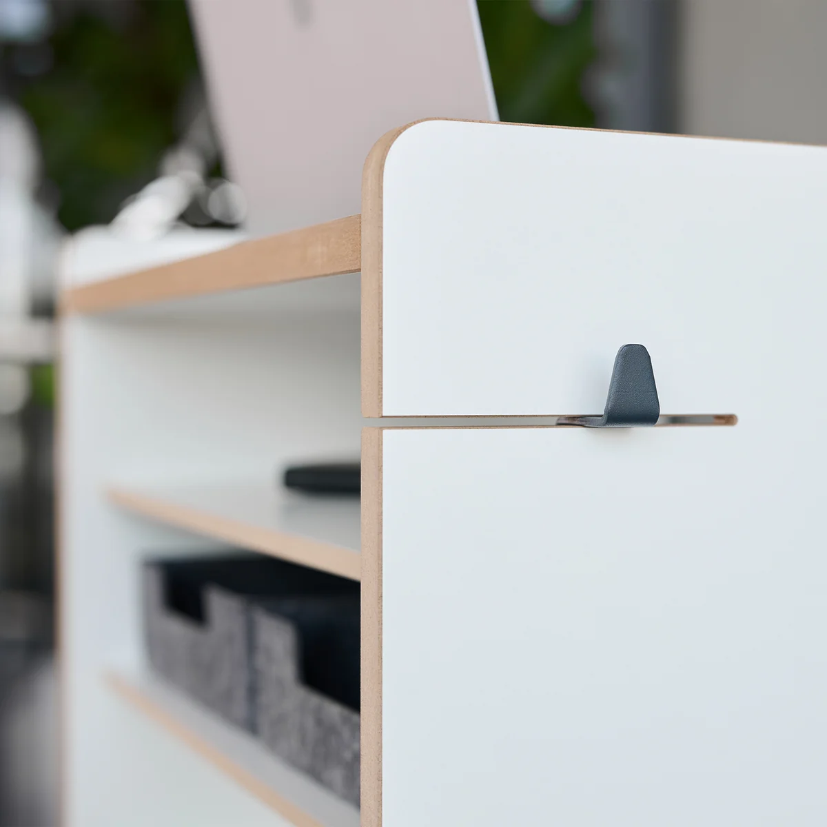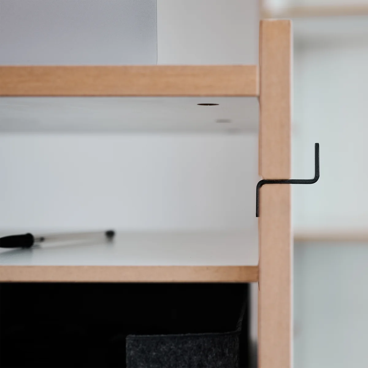 Das durchdachte Design bietet zahlreiche Stauraummöglichkeiten, darunter Fächer für Körbe, Kisten oder Boxen sowie einen seitlichen Haken für Geschirrtücher, Kabel oder Kopfhörer. Erhältlich in verschiedenen Ausführungen – mit drei Fächern oder einem Fach und einem Flascheneinsatz – lässt sich der Tojo-fahrbar individuell anpassen und mit optionalen Filzboxen erweitern.