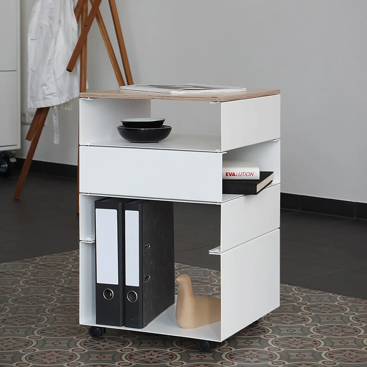 Der Rollcontainer Rolf ist eine konfigurierbare Aufbewahrung von vonbox, die sich den individuellen Bedürfnissen und Wünschen im Handumdrehen anpasst. Rolf besteht aus vier Einzelmodulen, gefertigt aus pulverbeschichtetem Stahlblech, die sich durch Magnete einfach miteinander verbinden lassen. So kann die Größe der Fächer und die Gesamterscheinung des Rollcontainers einfach bestimmt werden. Durch die kinderleichte Montage, ganz ohne Schrauben, lässt sich spontan entscheiden, ob Rolf aus 2, 3 oder 4 Modulen bestehen soll und wie diese zueinander positioniert sind. Eine lackierte Birkensperrholzplatte, die ebenfalls mit Magneten ausgestattet ist, dient als Ablage und lässt sich auf das entsprechende Endmodul setzen.