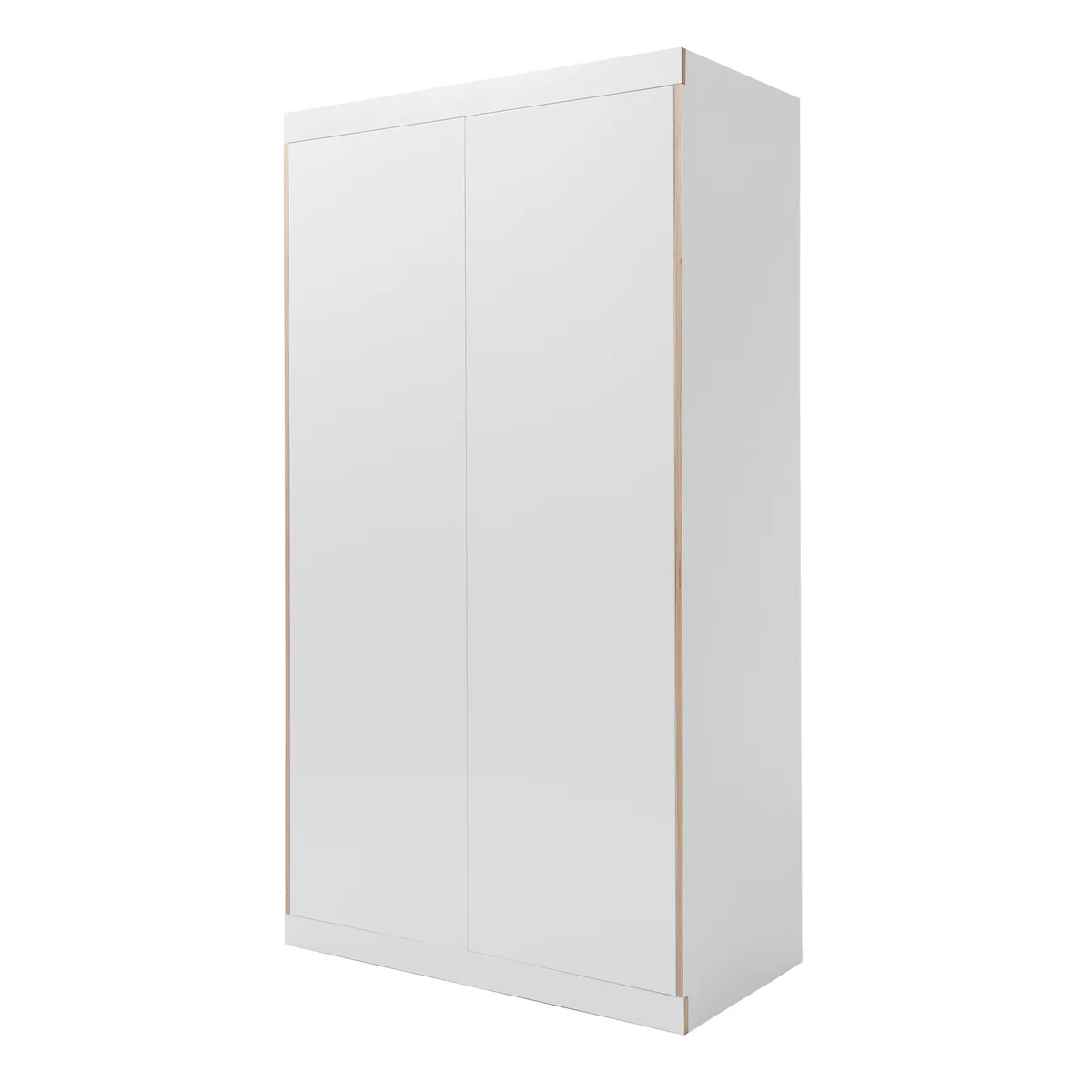 Durch die fehlenden Griffe bekommt die Außenseite ein glattes und edles Aussehen, welches durch die natürliche Birkenschichtholzkante aufgebrochen wird. Zu öffnen ist der Schrank mit der Push-to-Open Druckmechanik. Die umrahmte Oberseite des Schranks kann als Ablagefläche und Stauraum genutzt werden. Der Schrank aus Spanplatte mit Melamin-Belegung wird mit einem Konstruktionsboden und einer Kleiderstange geliefert. Beide Elemente können auf beliebiger Höhe im Kleiderschrank befestigt werden.