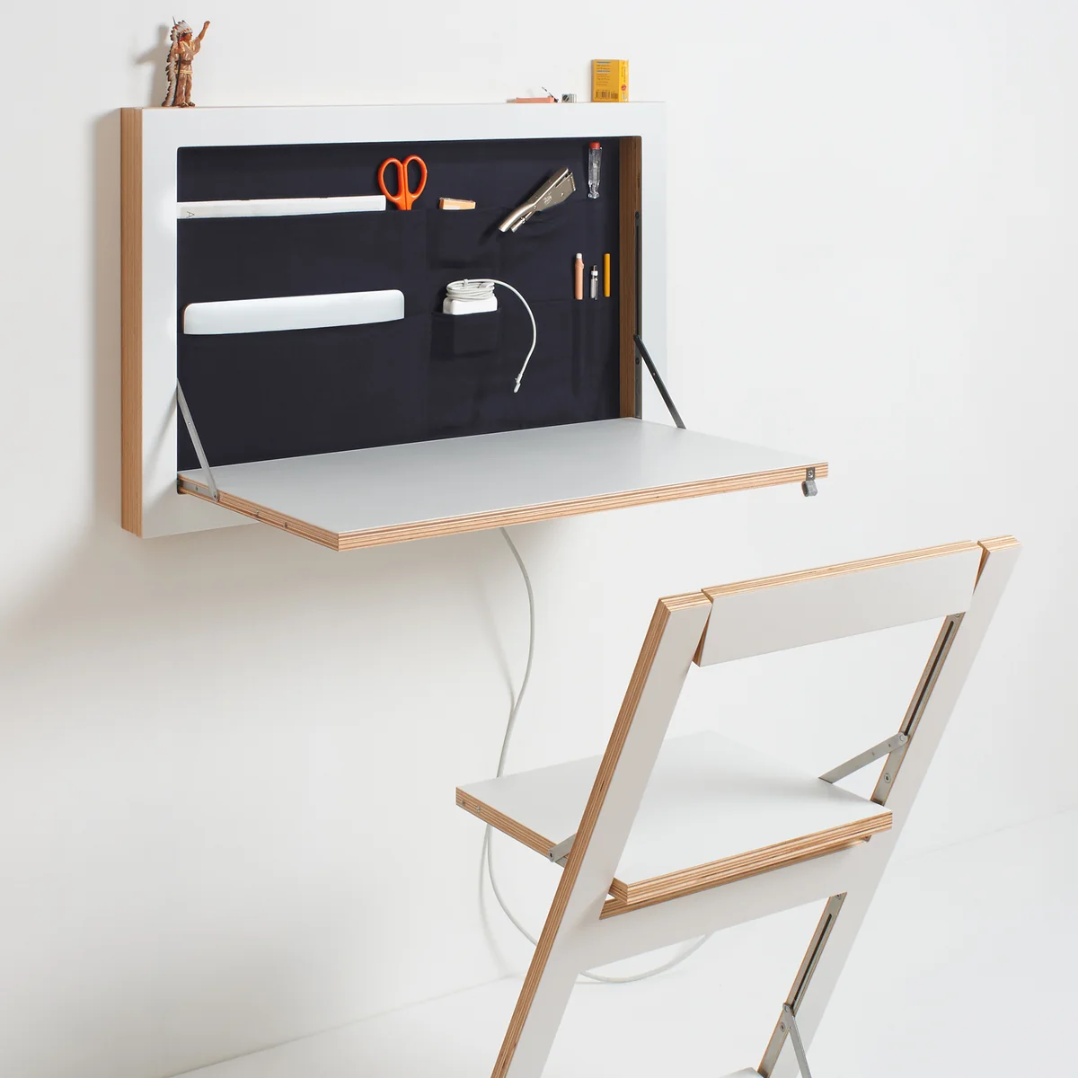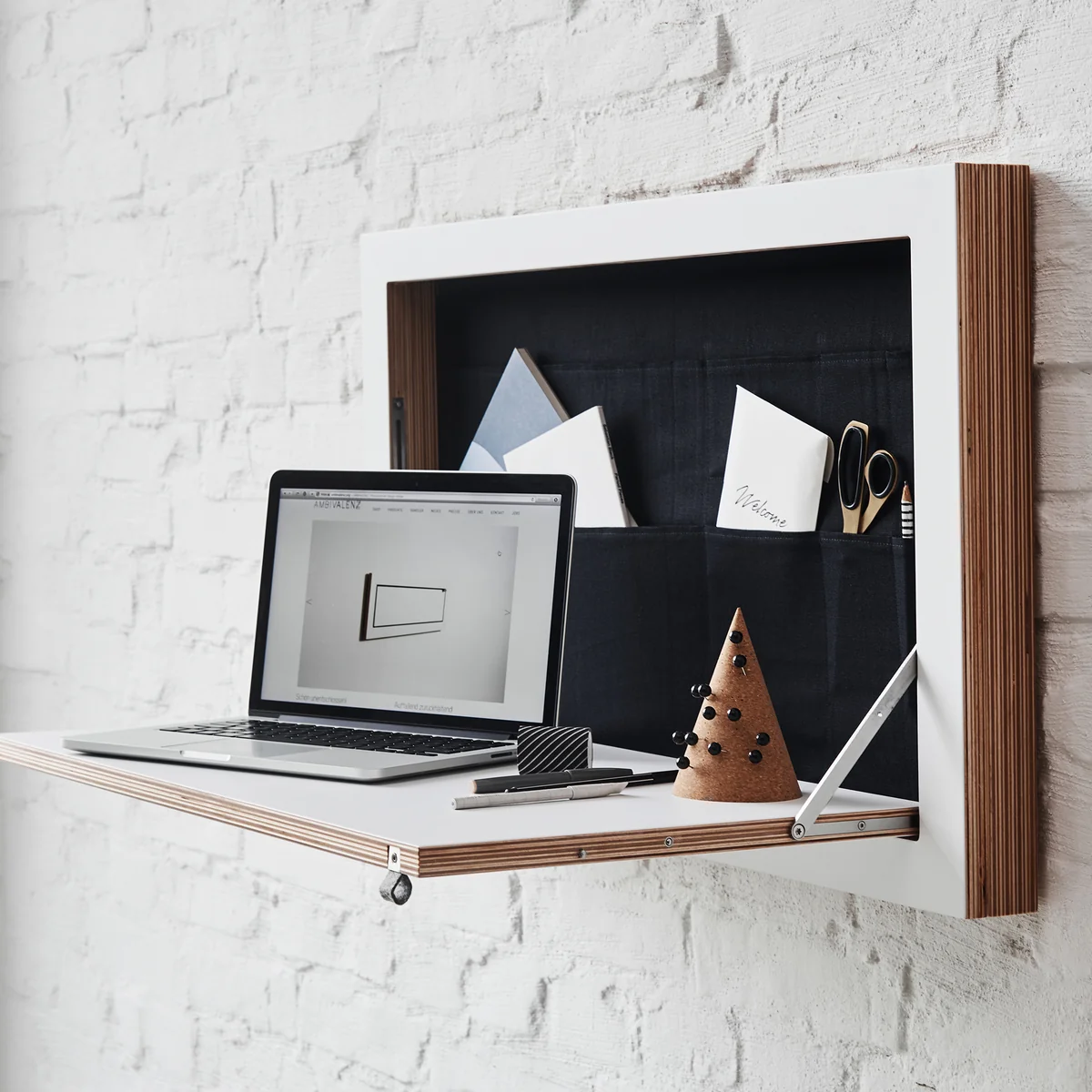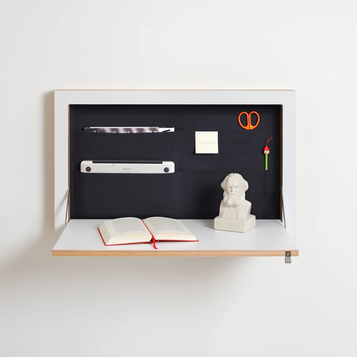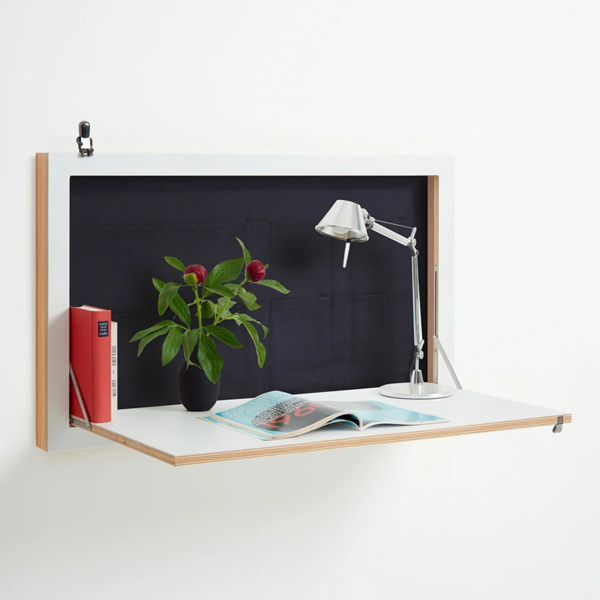 Der Fläpps Staatssekretär/in von Ambivalenz ist ein klappbarer Sekretär für die Wand. Eingeklappt überzeugt der Sekretär mit einer extrem dünnen Gesamttiefe, doch erst ausgeklappt entfaltet er seine gesamtes Potenzial.