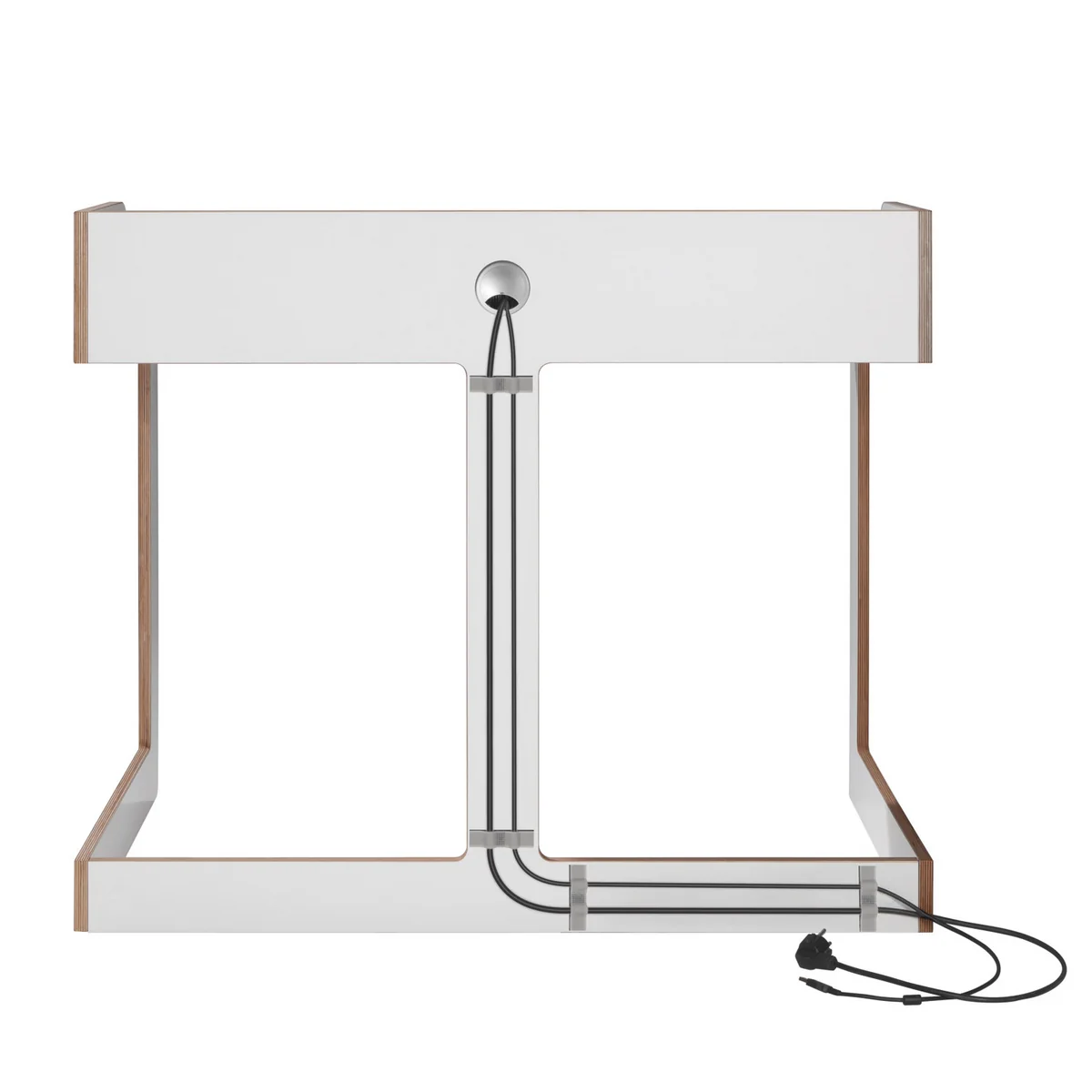 Der von Felix Stark gestaltete Sekretär ist mit zwei Schubladen ausgestattet, die sich unter der Oberplatte verbergen. Zwischen den Schubladen befindet sich mittig ein verblendeter Kabeldurchlass, über den die Kabel unsichtbar hinter den Sekretär geführt werden. Auch die obere Ablagefläche des Plane Sekretärs ist so gearbeitet, dass von hier aus das Kabel über eine Ausfräsung hinter dem Sekretär verschwinden kann. Auf der Rückseite verbergen sich die Kabel hinter einem schmalen Steg, der sich perfekt in das Design des Möbelstücks einfügt.