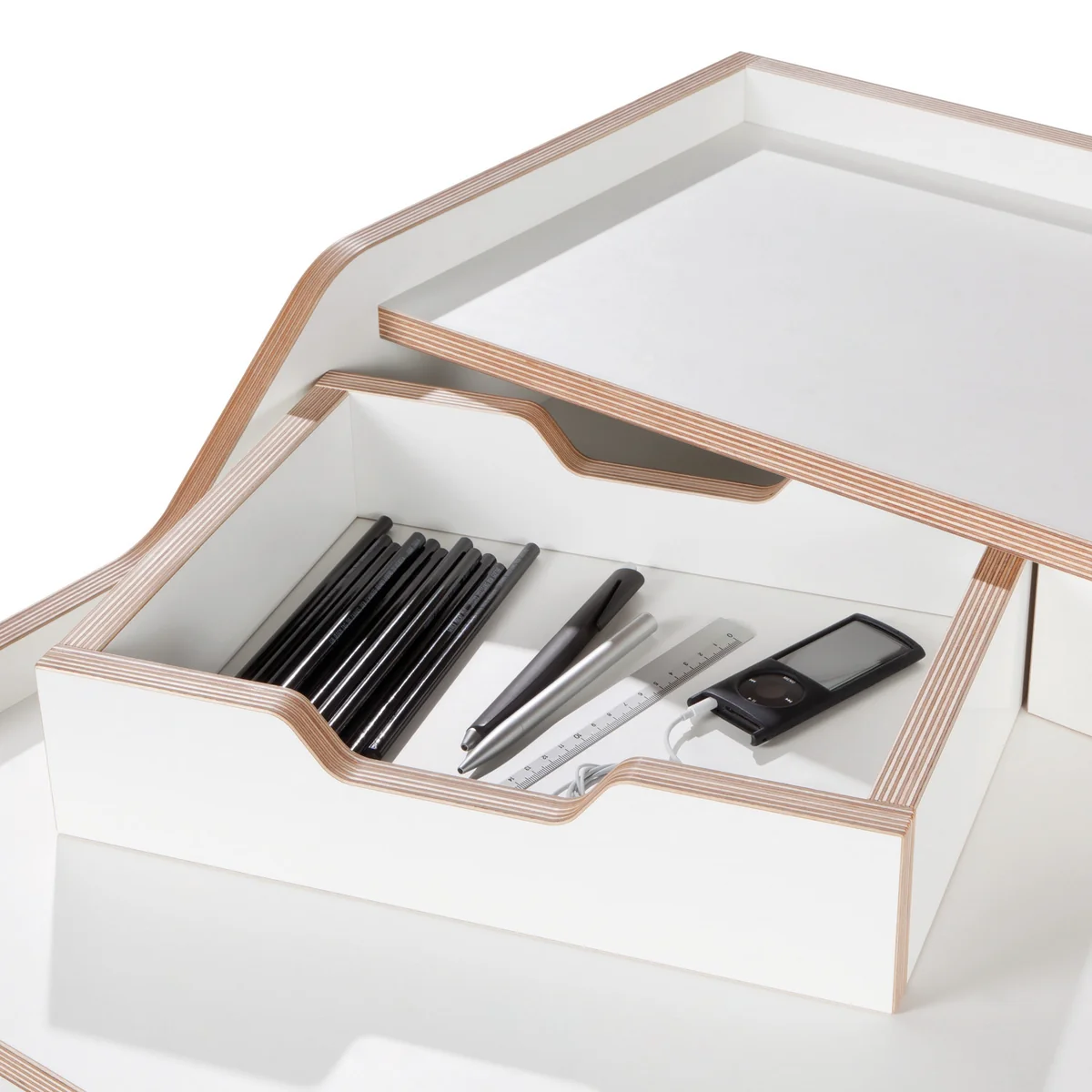Der feine Sekretär mit intelligenten Details ist aus Birken-Multiplexplatten gearbeitet und mit Melaminharz beschichtet. Die Flächen sind in verschiedenen Farben lackiert. Die Kanten sind naturbelassen und geölt. So entsteht ein angenehmer Kontrast in der Farbgebung des Sekretärs aus den Müller Mövelwerkstätten.