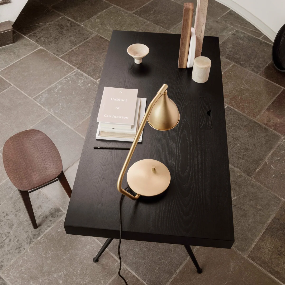 Der Schreibtisch wird von einem Gestell aus Aluminium getragen, das in einer mattschwarzen Pulverbeschichtung erhältlich ist. Die konisch geformten Beine treffen in der Mitte unter der Tischplatte aufeinander, was dem Tisch einen sehr leichten und eleganten Ausdruck verleiht.