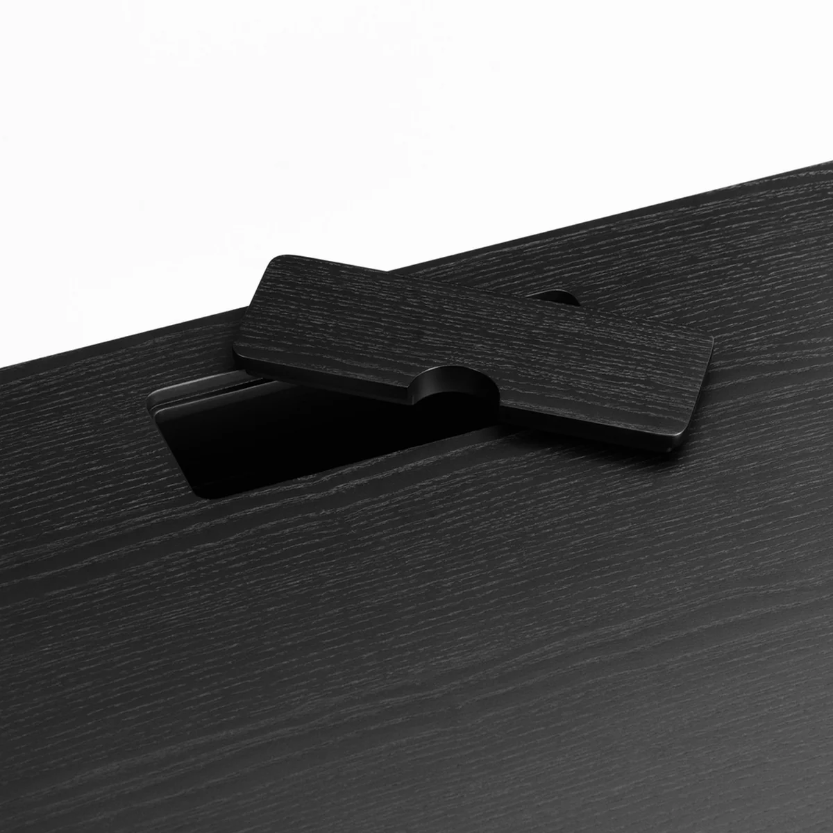 Der Schreibtisch hat eine schlanke Tischplatte aus Furnier mit drei eingebauten Schubladen. Die Schubladen haben eine Innenhöhe von 4 cm und sind somit ideal zum Verstauen von Laptops, Briefen und verschiedene Büroartikeln geeignet. Der Tischplattenkern ist aus MDF gefertigt und mit Palisanderfurnier oder Schwarzeschenfurnier erhältlich. Die Tischplatte hat einen kleinen Innenraum für einen Stromverteiler, sodass sowohl Smartphones als auch Laptops problemlos mit Strom versorgt werden können. Das Kabel vom Stromverteiler wird durch ein kleines Loch durch eines der Beine gezogen und bildet so einen eleganten Schreibtisch ohne störende Kabel auf dem Boden.
