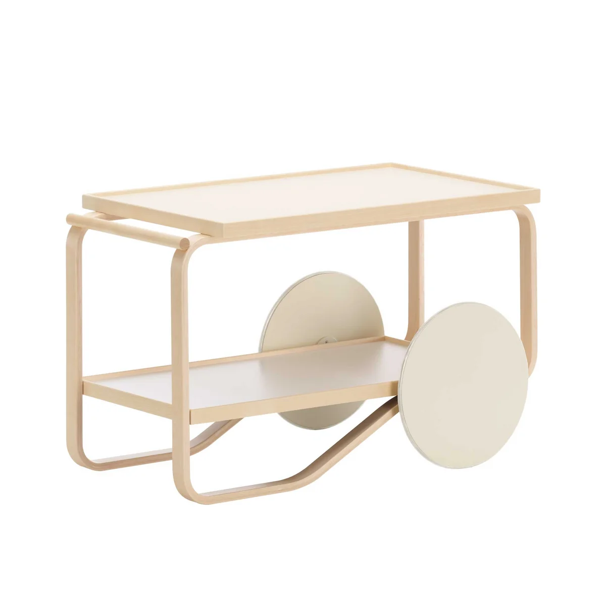 Der Servierwagen 901 ist ein Entwurf des finnischen Designers Alvar Aalto, der sich hierbei, zusammen mit seiner Frau Aino Aalto, von der britischen Teekultur inspirieren ließ. Ausgestattet ist der rollende Wagen mit zwei Rädern und einem Gestell aus gebogenem Schichtholz, das nach dem Prinzip des Bugverfahrens gefertigt wurde. Bereits in den 1920er Jahren experimentiert Aalto mit mit dem Werkstoff Holz, versucht es in eine geschwungene Form zu bringen und findet letztendliche eine Methode, um dünne, verleimte Holzschichten unter Wärmeeinfluss zu biegen.