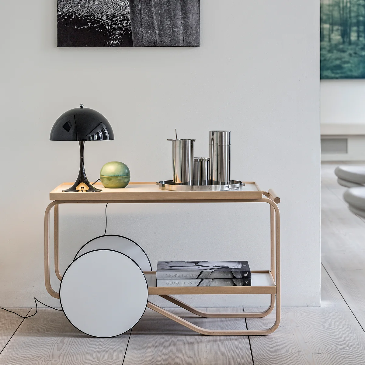Der Servierwagen 901 lässt sich klassisch als Teewagen nutzen, kann jedoch auch als Beistelltisch, dekoriert mit einer Leuchte, Büchern oder einem Blumenstrauß hervorragend in Szene gesetzt werden. Auf den Linoleumplatten lassen sich Gegenstände aller Art auf zwei Etagen nach Wunsch arrangierten.
