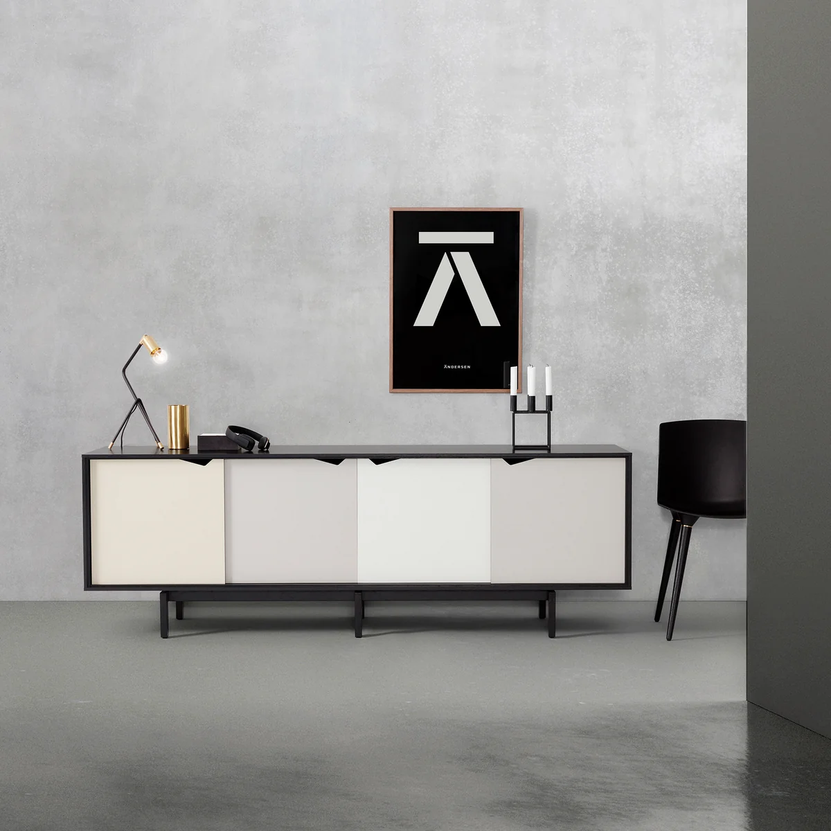 Neben dem S1 Sideboard von byKATO für Andersen Furniture mit mehrfarbigen Türen gibt es die Kommode auch in einer einfarbigen Sideboard-Version .