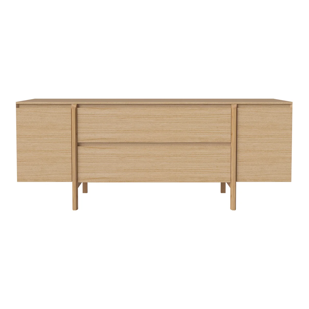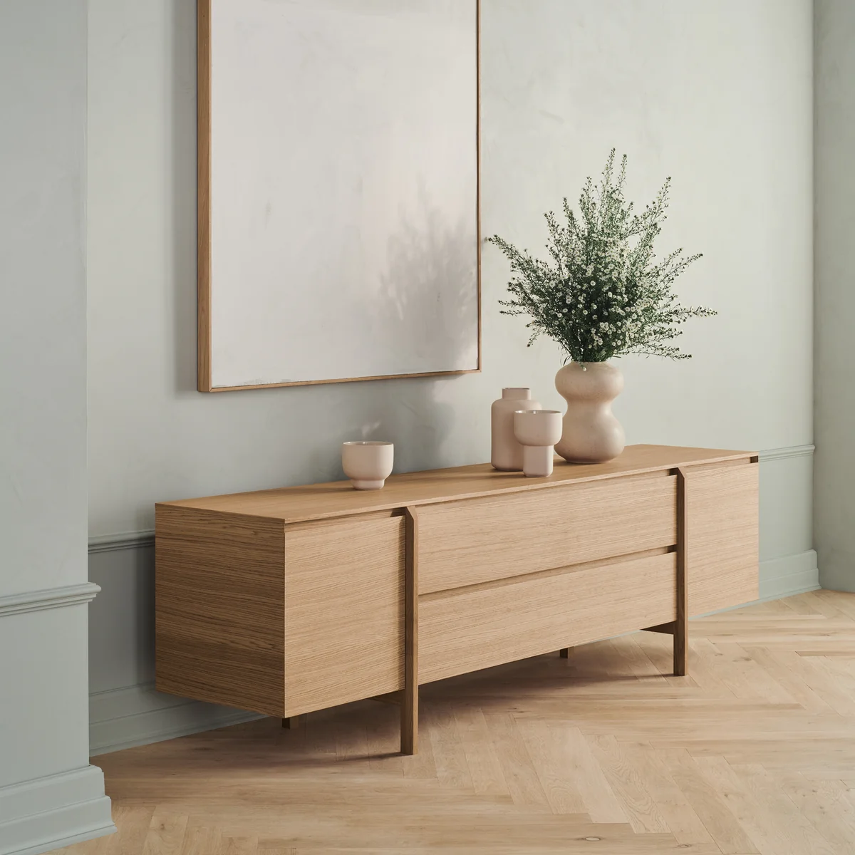 Das Daia Sideboard von Ramos Bassols für Bolia. Die Serie Daia ermöglicht eine durchdachte Organisation des Wohnraums und ist gleichzeitig ein schönes Möbelstück. Entworfen vom spanischen Studio Ramos Bassols und inspiriert von der eleganten, horizontalen amerikanischen Architektur der 1950er Jahre, betont sie Funktionalität, Schwerkraft und Anmut. Mit seinen offenen Fächern oder Schubladen konfiguriert er ein geometrisches Design um seine beiden vertikalen Beine.