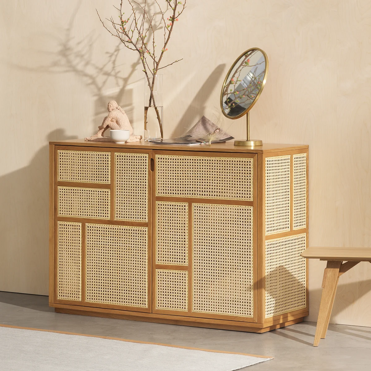 Der Rahmen des Sideboards wird aus lackiertem Birkenholz und MDF gefertigt. Ausgefacht mit einem hochwertig hergestellten Schilfrohrgeflecht. Zugangsöffnungen für Stromkabel sind vorgesehen.
