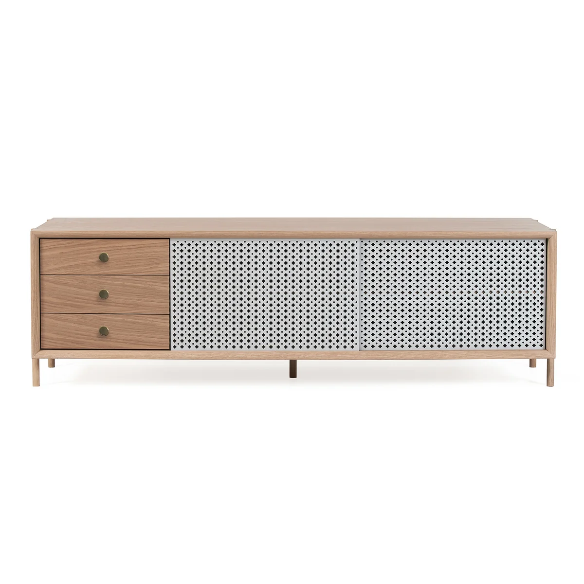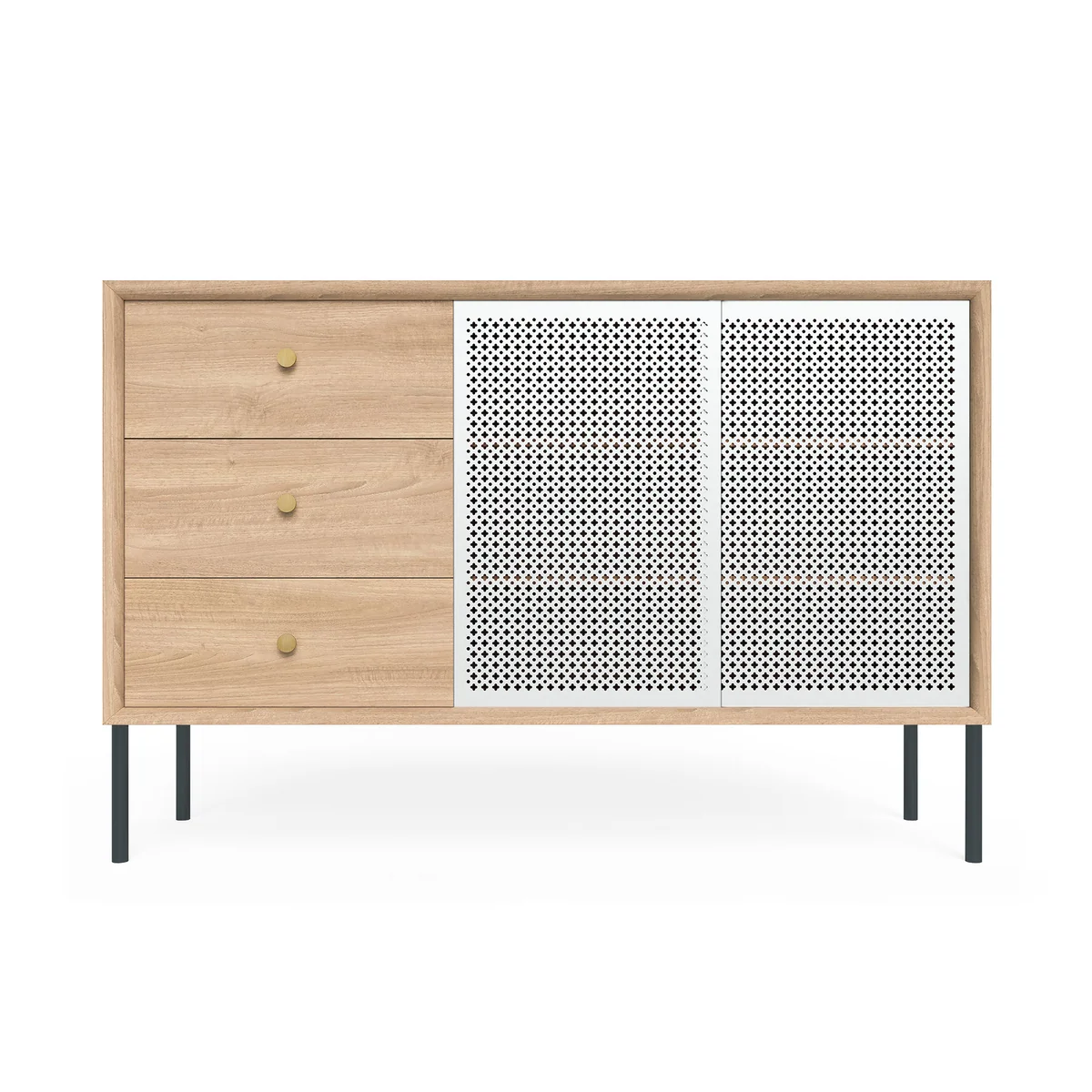 Das Gabin Sideboard des französischen Herstellers Hartô zeichnet sich durch seinen harmonischen Materialmix und die detailreiche Gestaltung aus. Der Korpus des Sideboards ist aus MDF Platten mit hochwertigem Eichen- und Walnussholz hergestellt, während die Schiebetüren aus Stahl gefertigt sind. Diese sind mit einer filigranen Perforierung versehen, die an die Handwerkskunst des Korbflechtens erinnert.