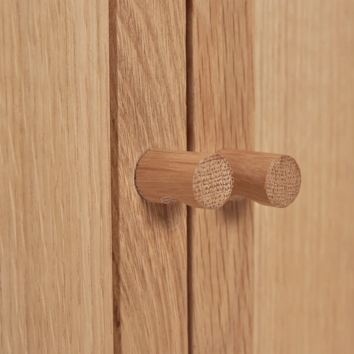 Hergestellt aus Eichenholz und Eichenfurnier, ist die Konsole langlebig und besonders robust. Die natürliche Optik und Maserung verleihen dem Wohnraum eine wohnliche und gemütliche Nuance, die sich durch weitere dekorative Objekte ergänzen und ausführen lässt.