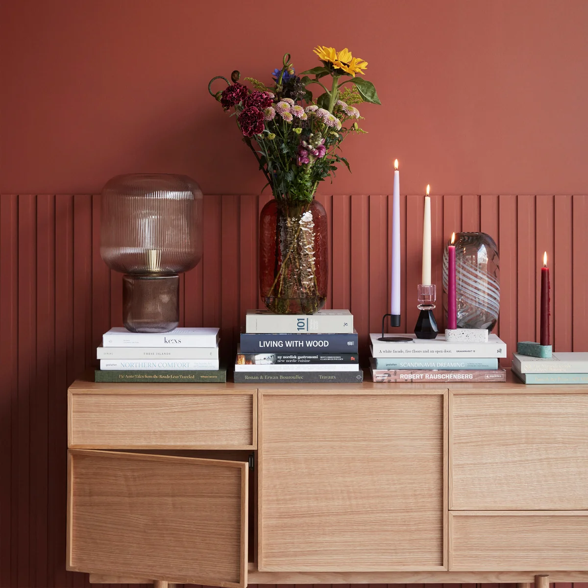 Dieses Sideboard von Hübsch Interior begeistert mit einem dezenten, skandinavischen Charme und einem äußerst großen Stauraum. Hinter mehreren Schubladen und Klapptüren verbirgt sich genug Platz für Geschirr, Bücher, Wohntextilien und Büromaterial. Öffnen lassen sich die Türen mithilfe der oberen angeschrägten Kanten – so stören keine Griffe das geradlinige Design.