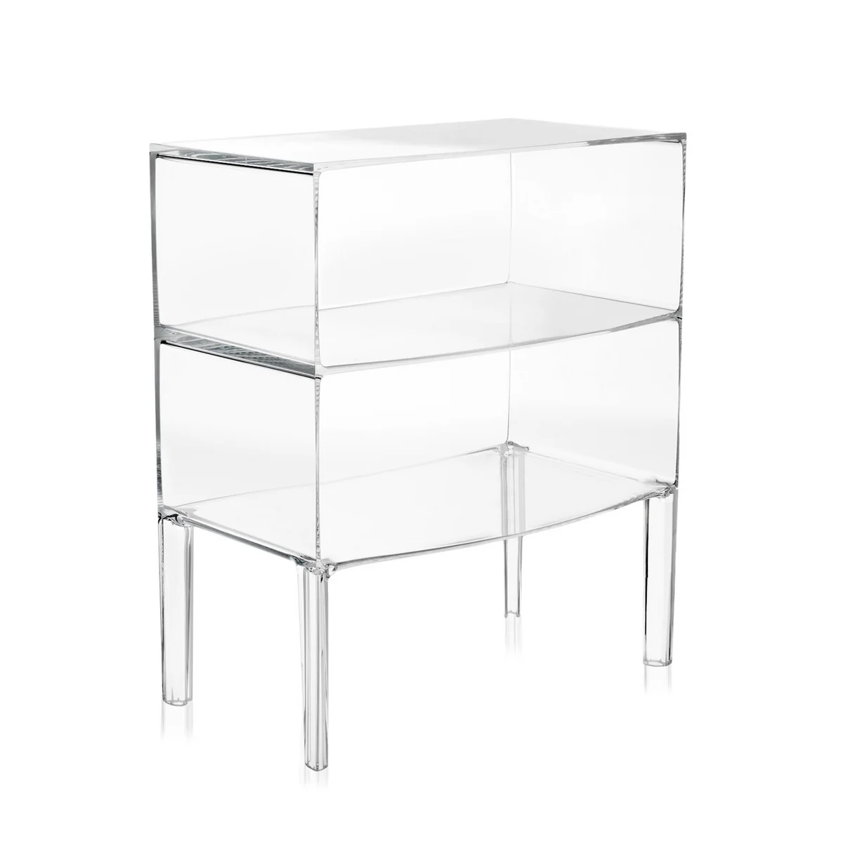 Ecken und Kurven sowie gerade und gewundene Linien erzeugen auf der Oberfläche der Ghost Buster Kommode ein raffiniertes Spiel von Perspektiven und Reflexen, das die Blicke auf sich zieht. Ghost Buster verfügt über offene Fächer und wird durch vier doppelseitig verarbeitete Beine gestützt.