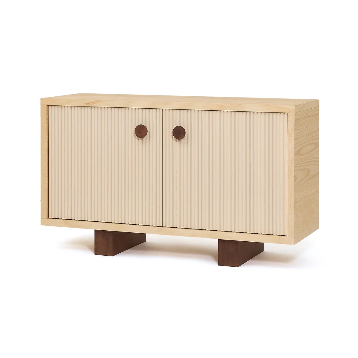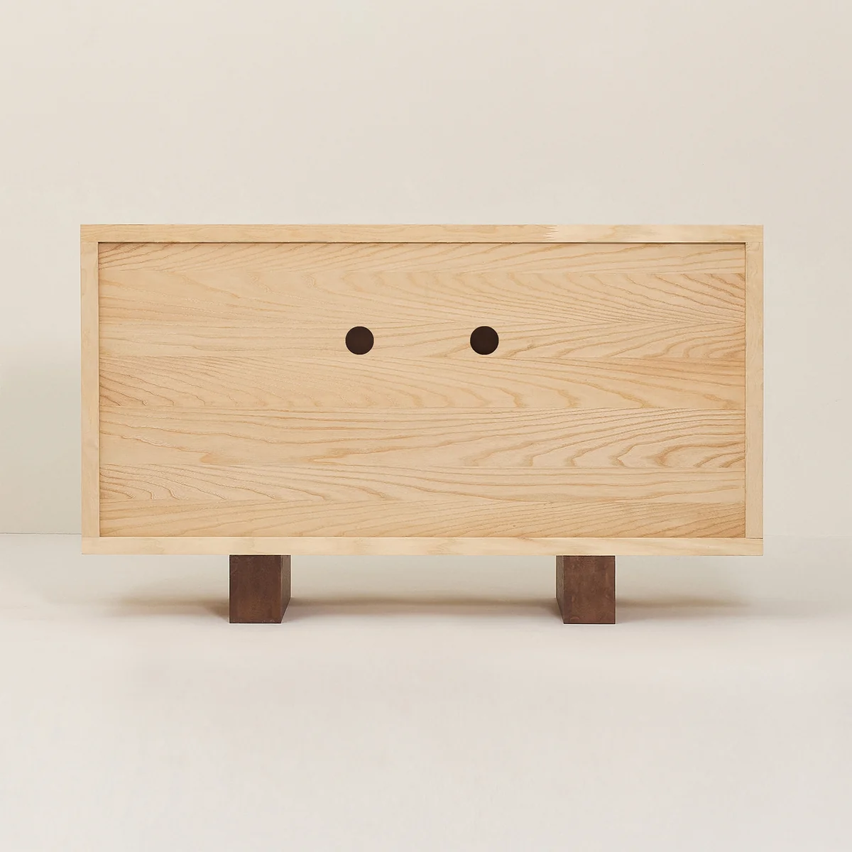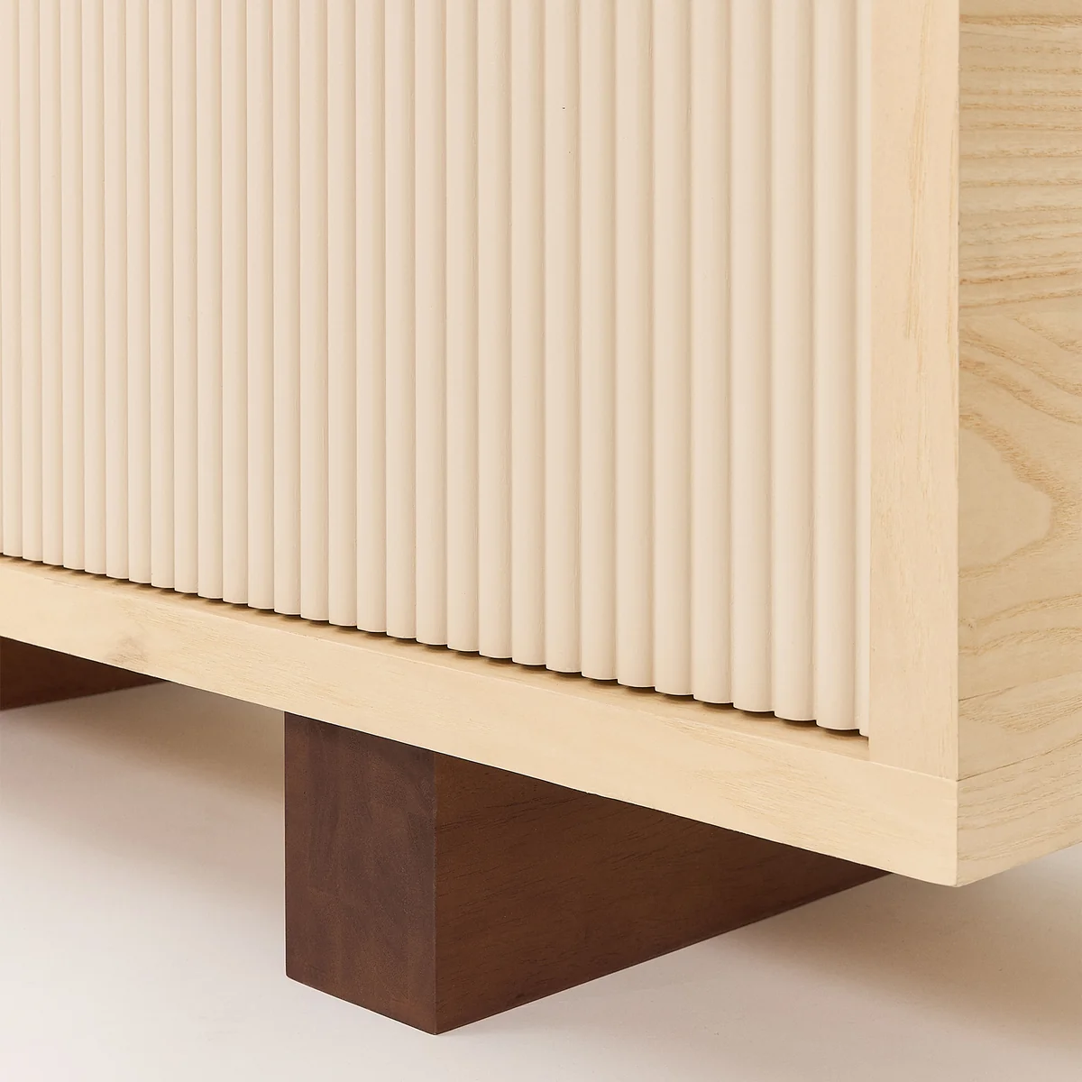 Die fein gerillten Türen erzeugen ein faszinierendes Spiel aus Licht und Schatten und laden Kinder dazu ein, die Oberflächen taktil zu entdecken. Abgerundete, kontrastreiche Griffe sorgen für eine kindgerechte Handhabung, ohne das puristische Design zu stören. Die markanten Beine, angelehnt an japanische Geta-Sandalen, runden das Gesamtbild ab und geben dem Möbelstück einen schwebenden, zeitlosen Charakter.