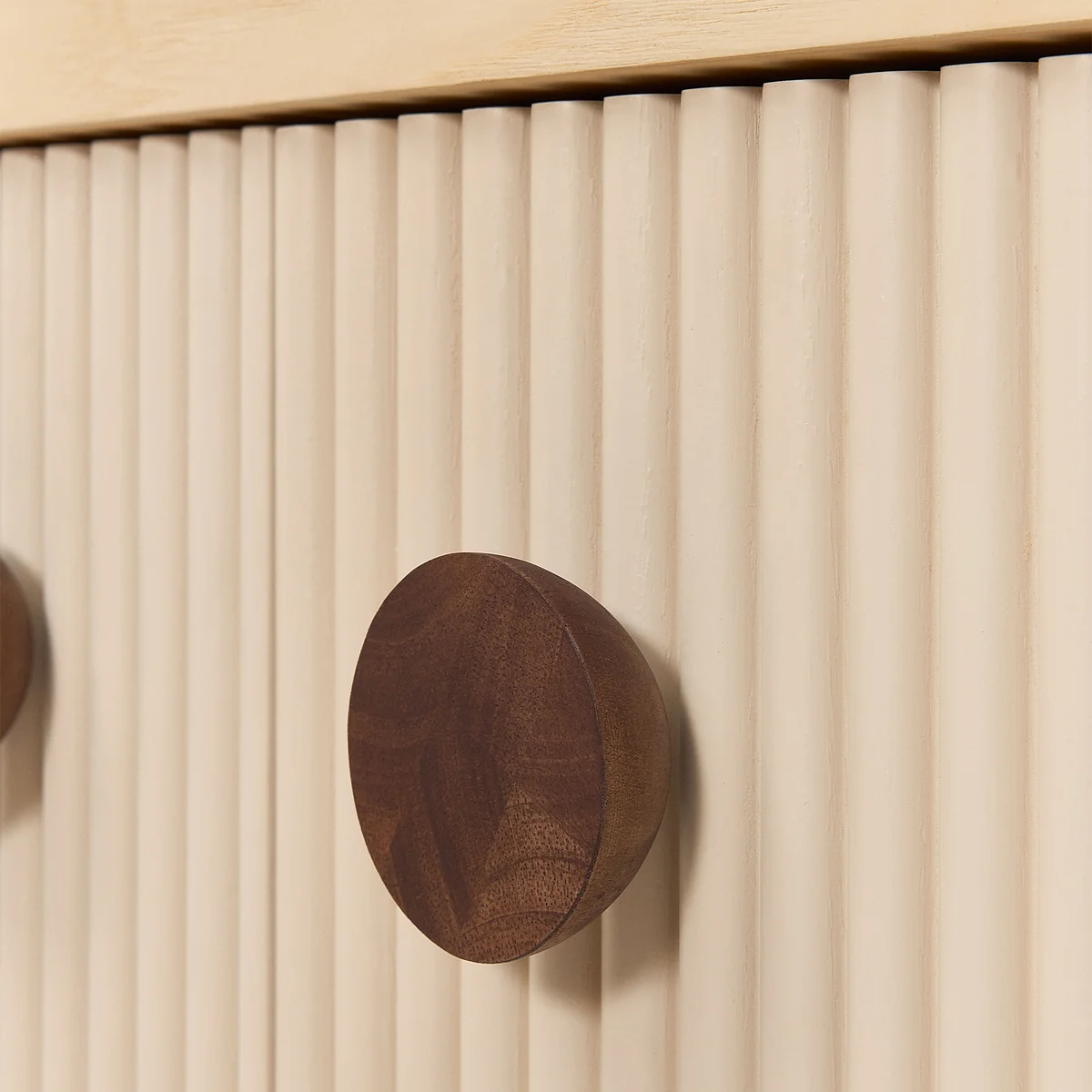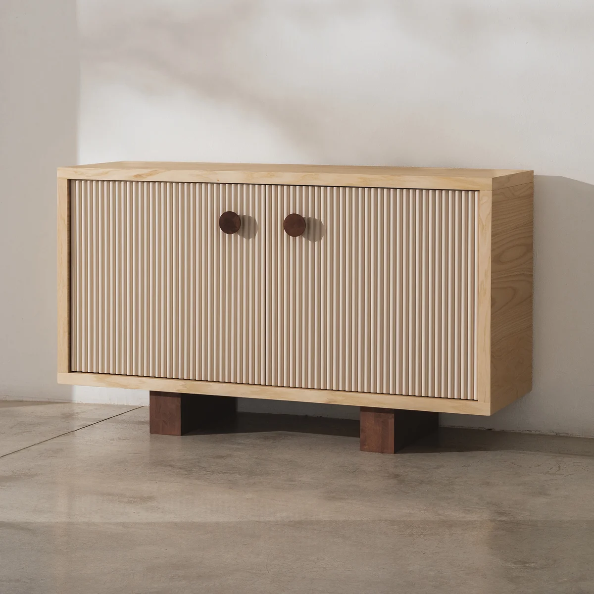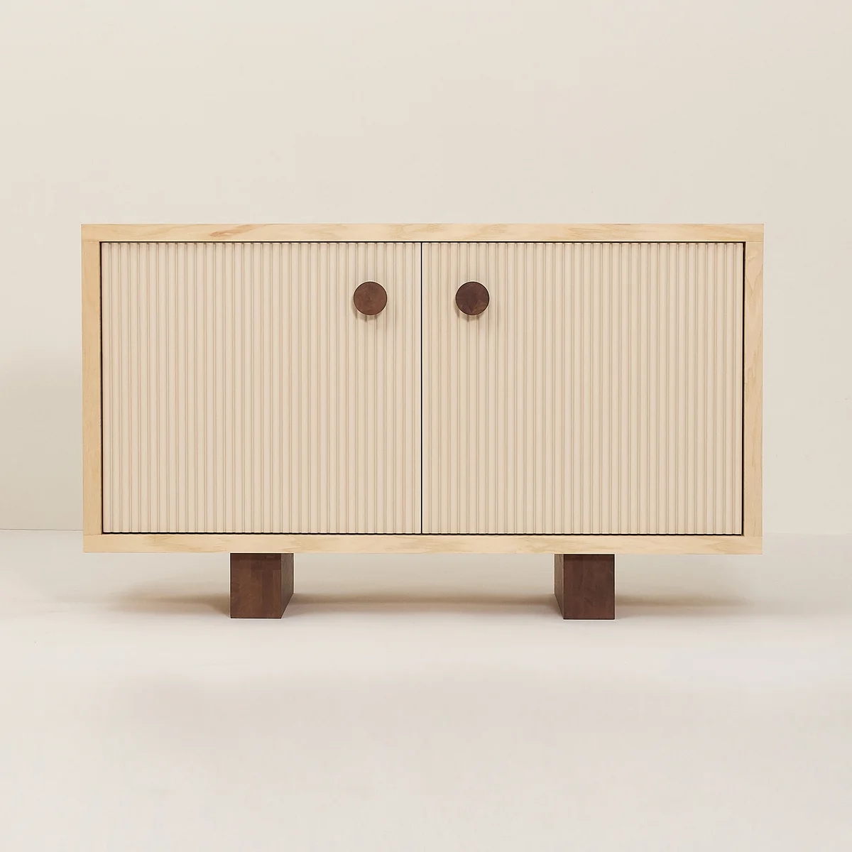 Die fein gerillten Türen erzeugen ein faszinierendes Spiel aus Licht und Schatten und laden Kinder dazu ein, die Oberflächen taktil zu entdecken. Abgerundete, kontrastreiche Griffe sorgen für eine kindgerechte Handhabung, ohne das puristische Design zu stören. Die markanten Beine, angelehnt an japanische Geta-Sandalen, runden das Gesamtbild ab und geben dem Möbelstück einen schwebenden, zeitlosen Charakter.
