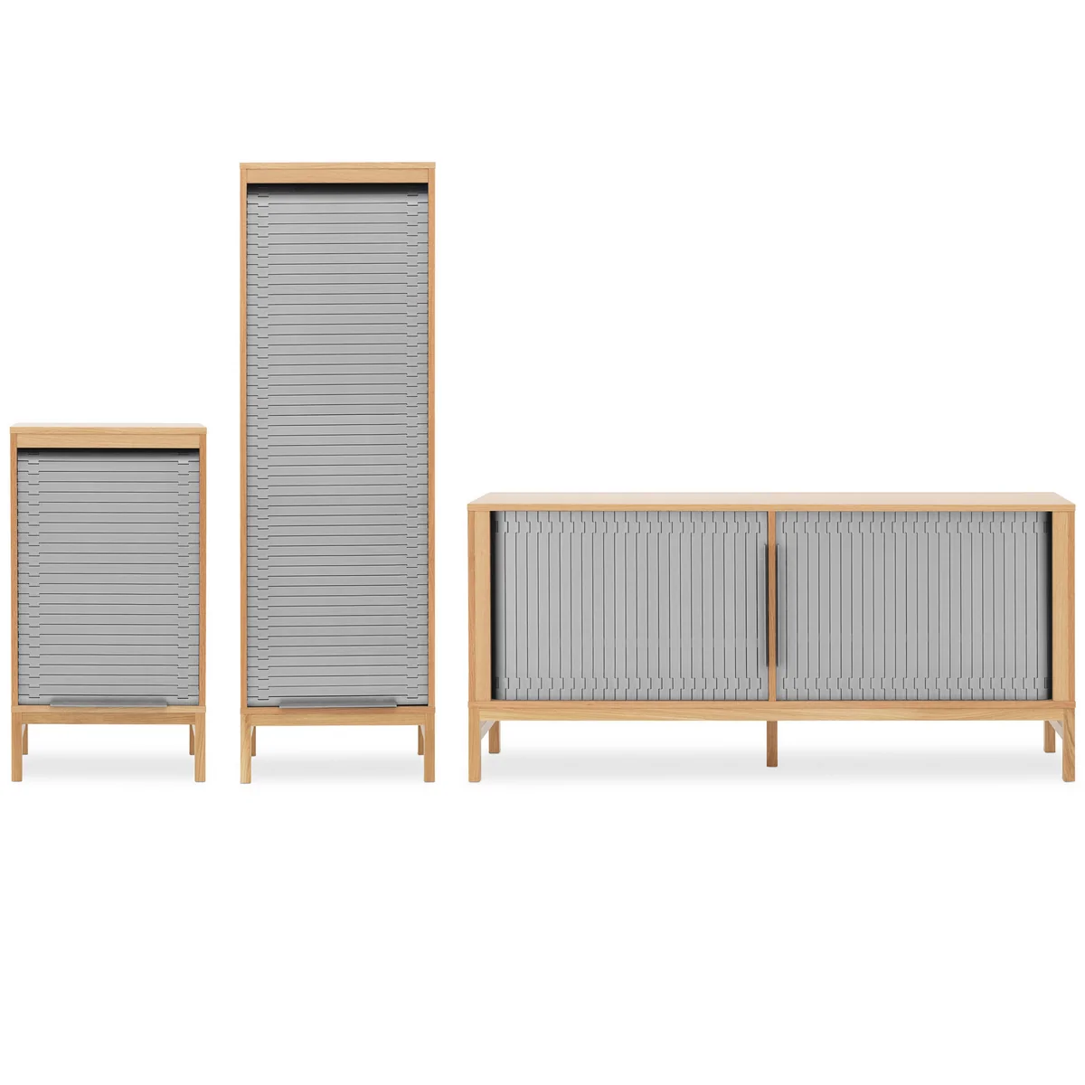 Das Jalousi Sideboard von Normann Copenhagen ist eine moderne Version der klassischen Schränke mir Schiebetüren, die sich so oft in Büros und Arbeitszimmern finden lassen. Das Jalousi Sideboard ist so weit überarbeitet, dass es sich auch im Wohnbereich gut macht und dabei nichts an den praktischen Vorzügen der Rollschränke verloren hat. Das Design stammt von Simon Legald, der sich für die Jalousi Serie von Armbanduhren, Förderbändern und 50er-Jahre-Möbel inspirieren ließ.