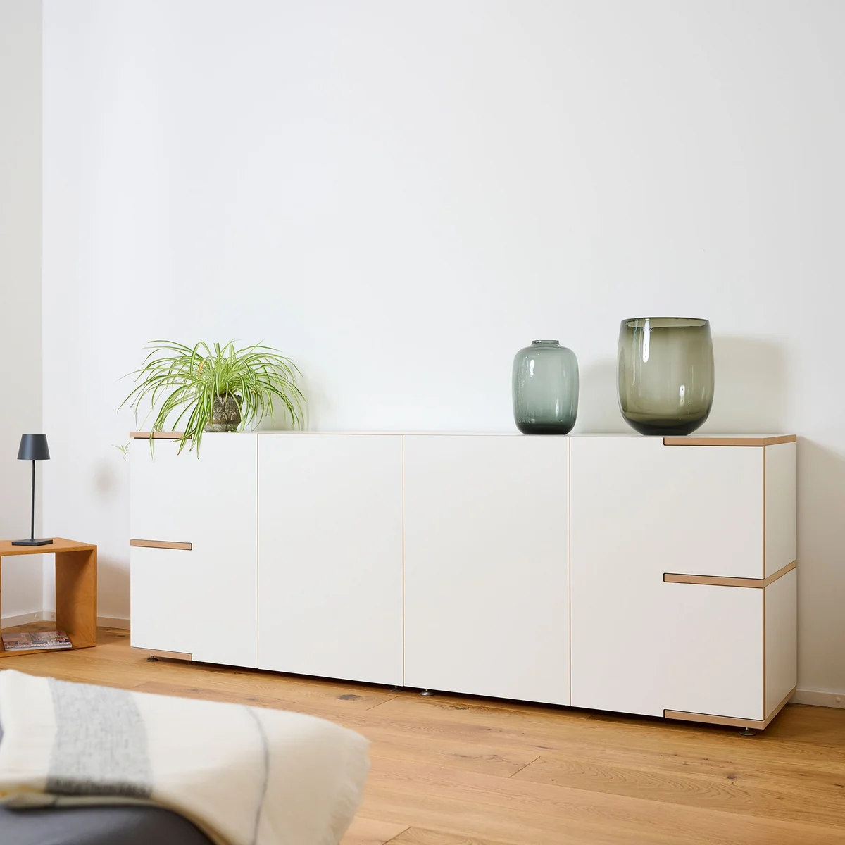 Das Tojo Sideboard präsentiert sich in puristischen und modernen Optik. Das monochrome Möbelstück wird durch schöne farbliche Details an den Kanten aufgewertet. Das Sideboard kann im Wohn- und Esszimmer, aber auch im Flur aufgestellt werden und bietet reichlich Platz für alltägliche Dinge. Die reduzierte Optik sorgt dafür, dass das Sideboard jede vorhandene Wohneinrichtung gut ergänzt, ohne den Raum zu stören. In unterschiedlichen Ausführungen erhältlich, ist das Sideboard ein Allrounder, der nichts zu wünschen übrig lässt.