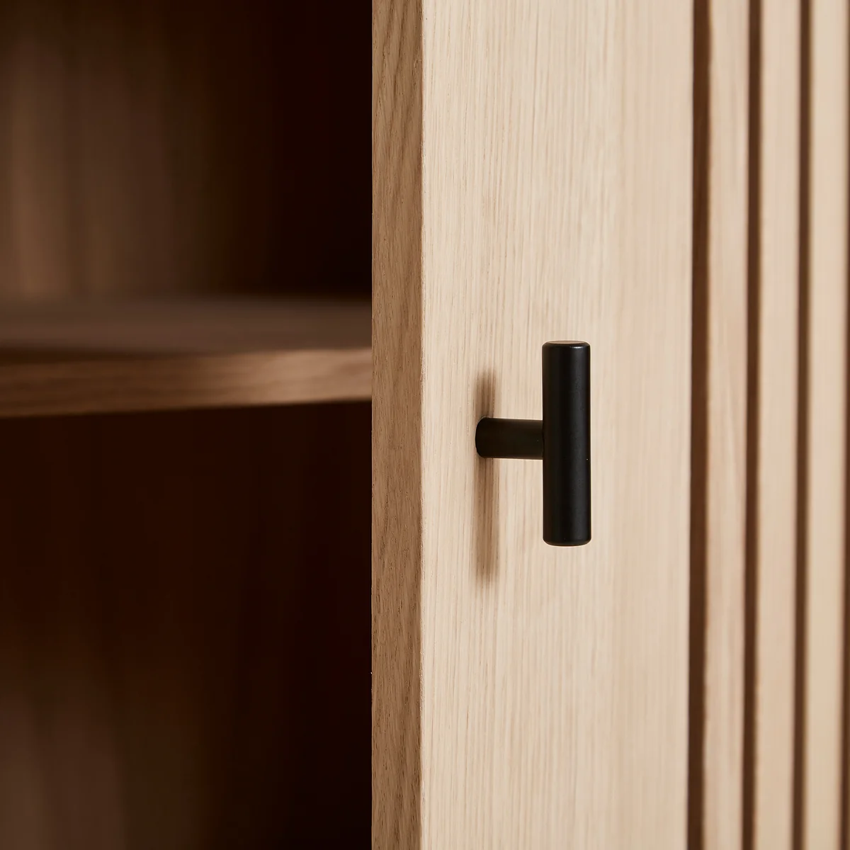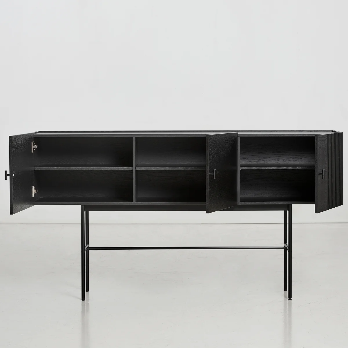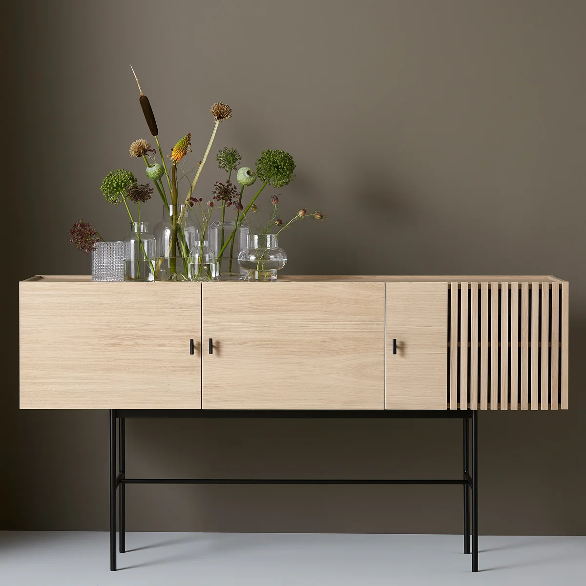 Die Sideboard-Serie Array von Woud ist inspiriert von der Holzschieferverkleidung moderner Gebäude. Entworfen wurden die Sideboards von Says Who. Die geometrische Form und die Vertiefungen im Holz sorgen für einen starken visuellen Effekt. Die schlanken Beine heben das Sideboard vom Boden ab und bilden einen eleganten Kontrast zum kantigen Gehäuse des Sideboards. Die Illusion von Transparenz weckt die Neugierde im Betrachter, was sich wohl hinter den geschlossenen Türen verbirgt.