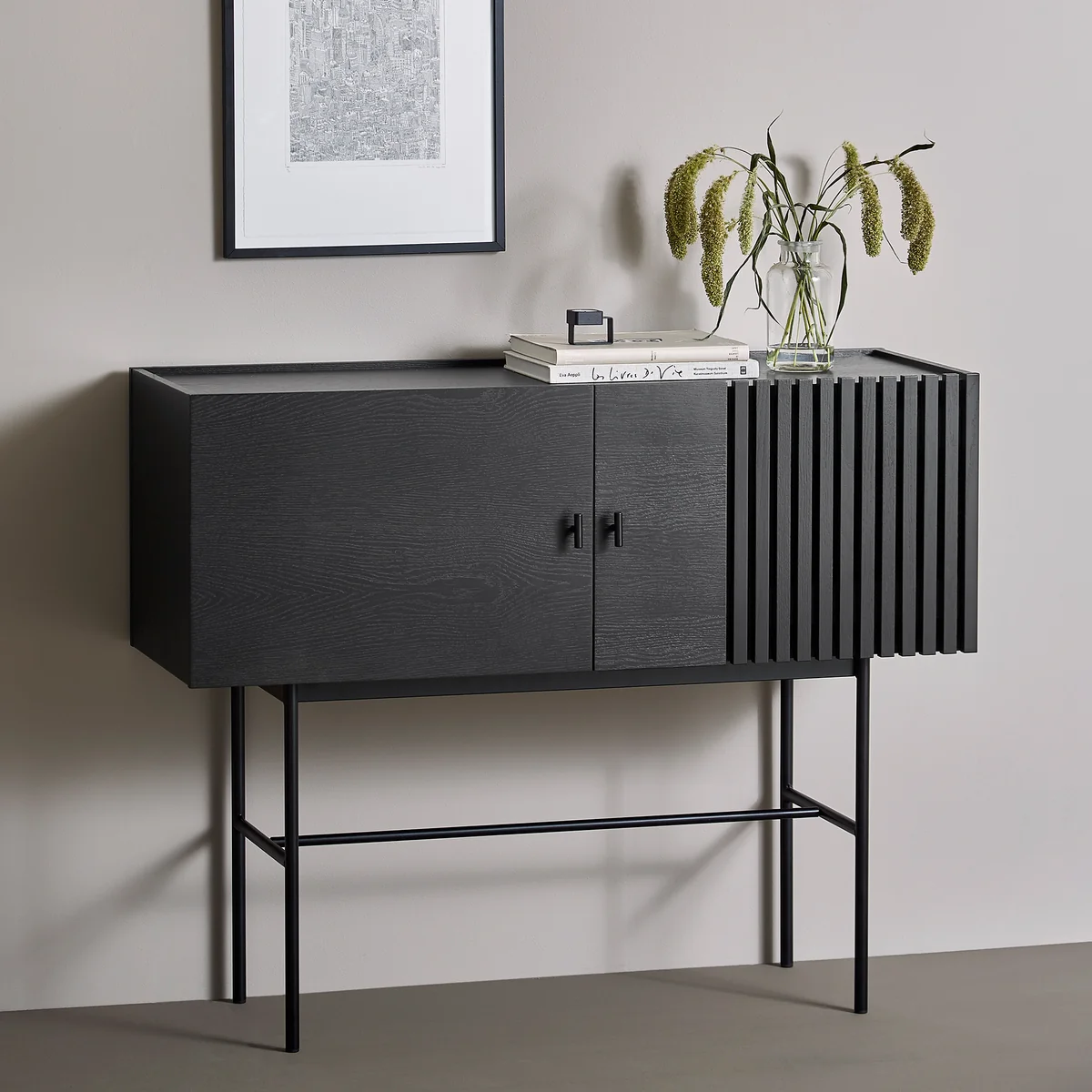 Das Sideboard wird zum dezenten Hingucker im Raum und verstaut zugleich viele verschiedene Dinge. Auf dem Sideboard lassen sich Vasen, Bücher und andere Dekorationselemente stilvoll präsentieren. Das Array Sideboard aus Eichenholz und lackiertem Stahl ist in verschiedenen Größen und Farben erhältlich.