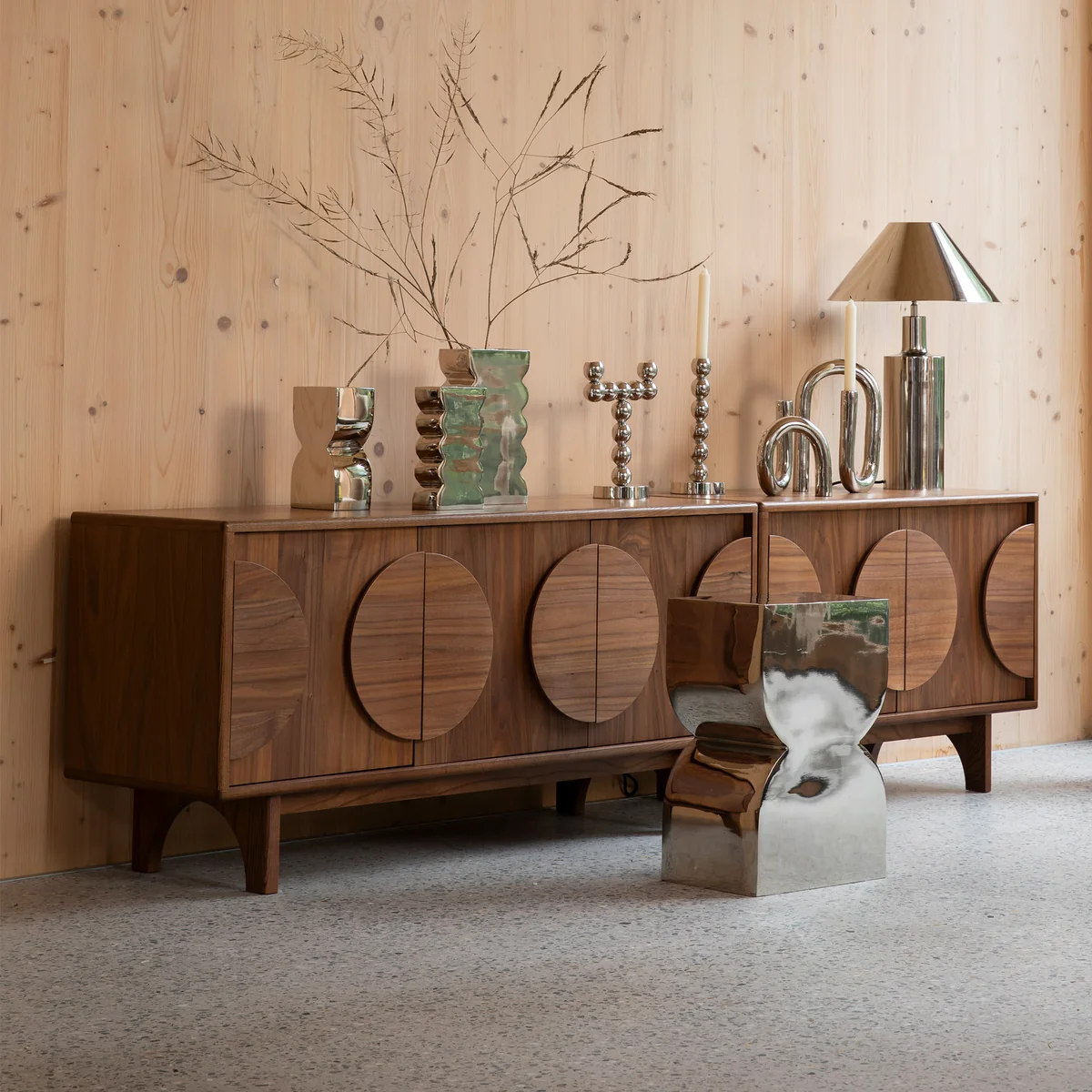 Das Groove Sideboard von Zuiver vereint großzügige Aufbewahrungsmöglichkeiten mit einem markanten Look. Die Holzfronten mit runden Elementen und die fein geschwungenen Beine verleihen dem Möbelstück eine ausdrucksstarke Formsprache mit einem Hauch Retro.