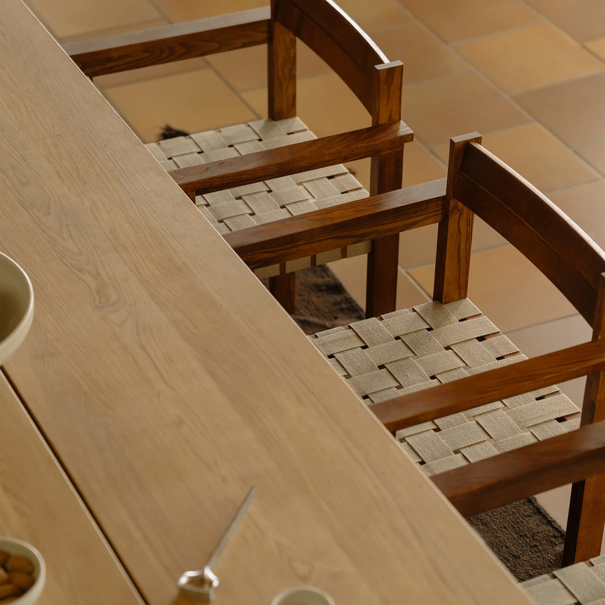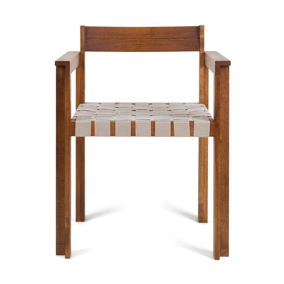 Der Symmetry Armlehnstuhl, entworfen von Studio 0405, vereint traditionelle Handwerkskunst mit modernem Minimalismus. Gefertigt aus gebeiztem Eschenholz in einem warmen Honigton und mit einer gewebten Sitzfläche, strahlt der Stuhl natürliche Eleganz und Leichtigkeit aus. Seine klare, aufrechte Form bietet stabilen Sitzkomfort – ob am Esstisch, im Wohnraum oder Büro. Die charakteristische Gurtbespannung sorgt für ein angenehmes Sitzgefühl und verweist auf klassische skandinavische Möbeltradition. Mit der Zeit entwickelt das Holz eine einzigartige Patina, die den Stuhl noch authentischer macht.
