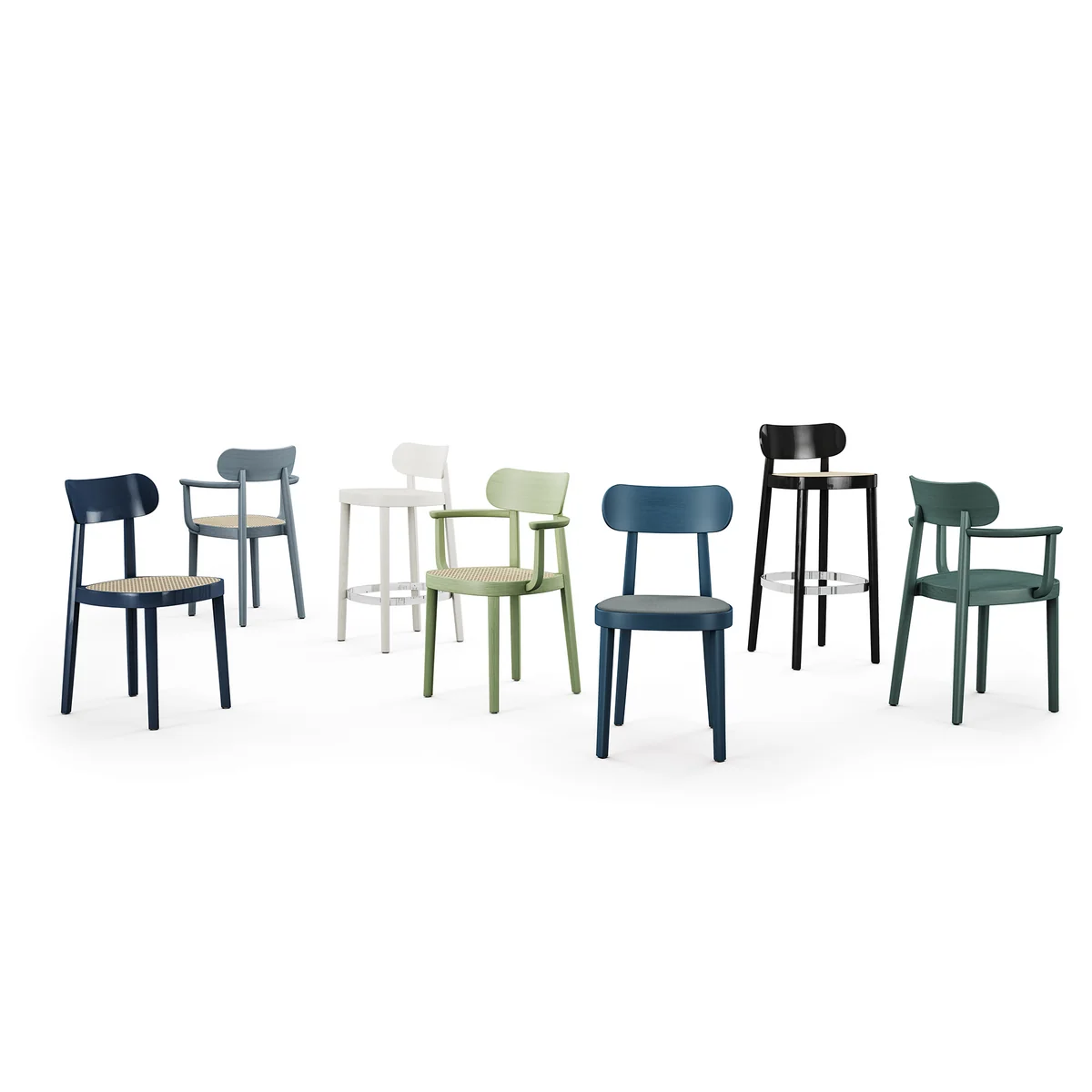 Der zeitlose 118 MF Armlehnstuhl bezieht sich in seiner Form des gebogenen Sitzrahmens auf den 214 Bugholzstuhl. Neue Elemente bekommt der Stuhl durch seine Beine. Auf der Rückseite abgerundet und auf der Innenseite gerade, nehmen die Stuhlbeine die hufeisenförmige Form der Sitzfläche an. Hinzukommt außerdem eine breite und einladende Armlehne, die das Sitzen im Modell 118 MF besonders komfortabel macht.