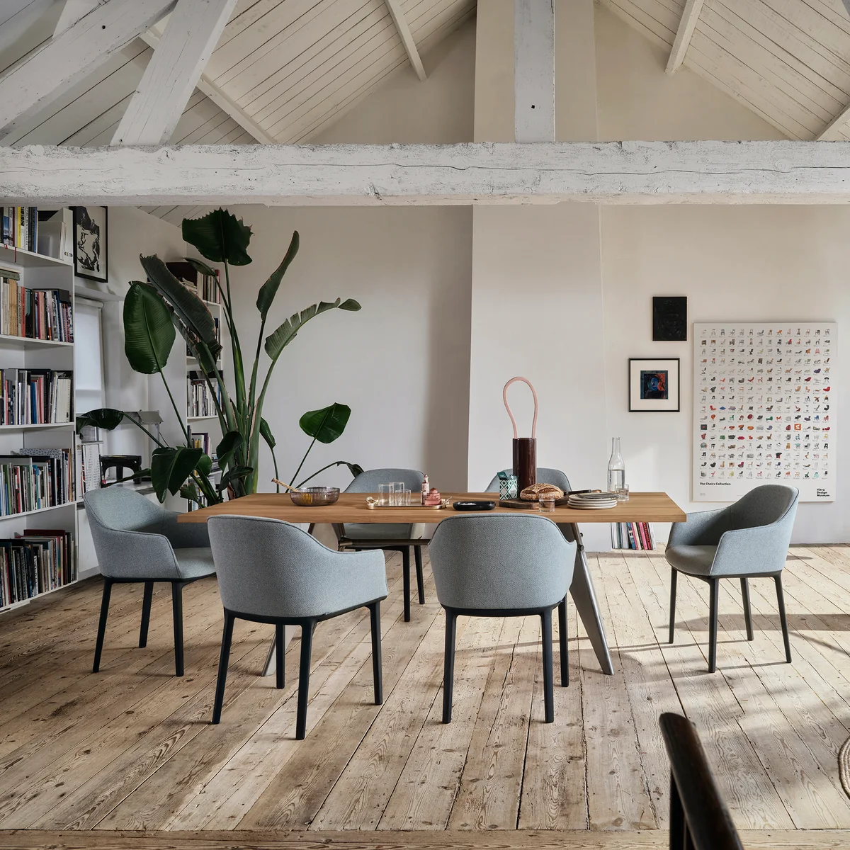 Der Softshell Armchair von Ronan und Erwan Bouroullec für den Hersteller Vitra begeistert mit seinem großartigen Komfort. Die Rückenlehne des Stuhls verfügt über flexible, integrierte Lamellen, welche maximale Bewegungsfreiheit bieten. Der Armlehnstuhl erhält dank seine Vierbeinuntergestells einen äußerst edlen Look. In gruppierter Ausführung können die Stühle wunderbar am Esstisch platziert werden. Die Polsterung aus Polyesterschaum sorgt für bequemes Sitzen im Alltag. Die Softshell Schale wird aus glasfaserverstärktem Polyamid gefertigt, das Untergestell besteht aus Polyamid.