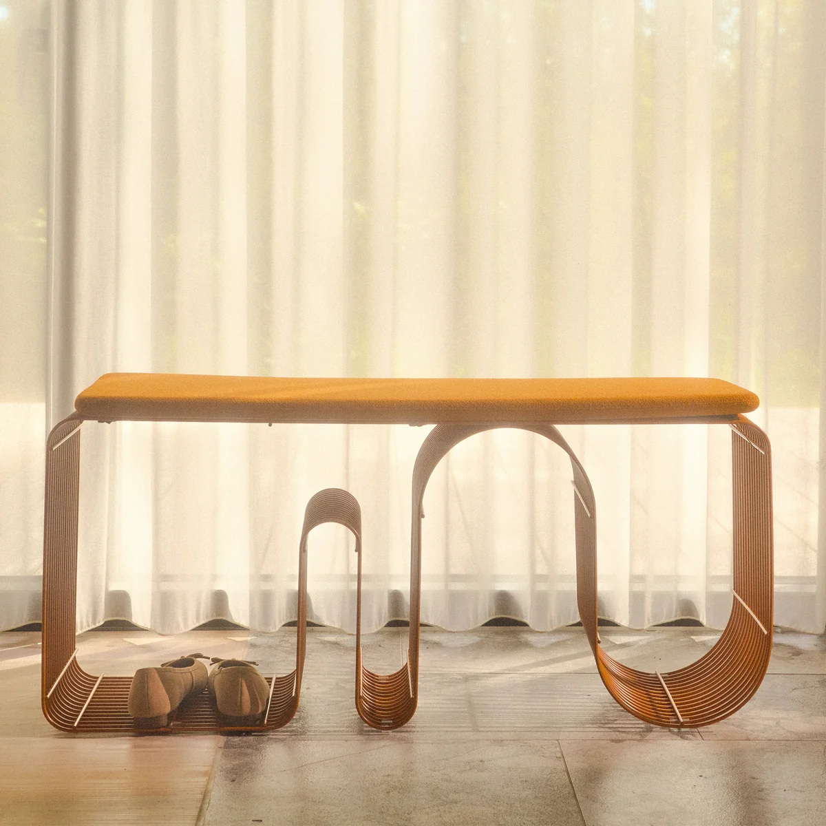 Dank ihrer Vielseitigkeit eignet sich die Curva Bank sowohl als Sitzgelegenheit im Eingangsbereich oder Schlafzimmer als auch als Beistelltisch im Wohnraum. Auch als Präsentationsfläche für Bücher oder dekorative Objekte setzt sie stilvolle Akzente. Ihr luftiges Design lässt sich mühelos in verschiedene Einrichtungsstile integrieren und sorgt dabei stets für eine besondere Note.