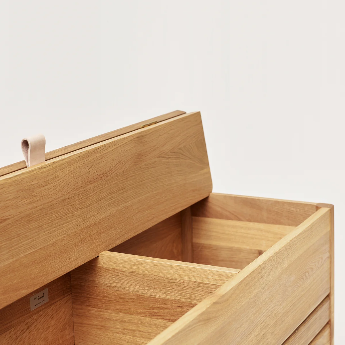 Die Truhe ist aus massiver, europäischer Eiche oder Buche gefertigt und das Lederband besteht aus naturgegerbtem Kernleder. Sie ist in mehreren Farbvarianten erhältlich.