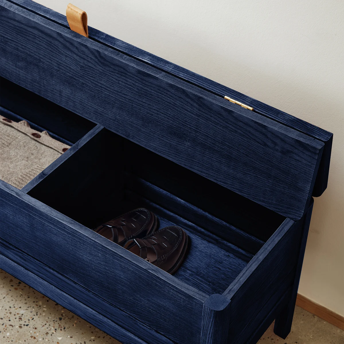 Die Designer Herman Studio sagen über das Produkt: „Die Truhenbank ist eine Neuauflage eines vielseitigen Möbelklassikers. Besonders wie man sie öffnet, mit einem Lederband, ist ein wichtiges Element beim Benutzen der Bank.“